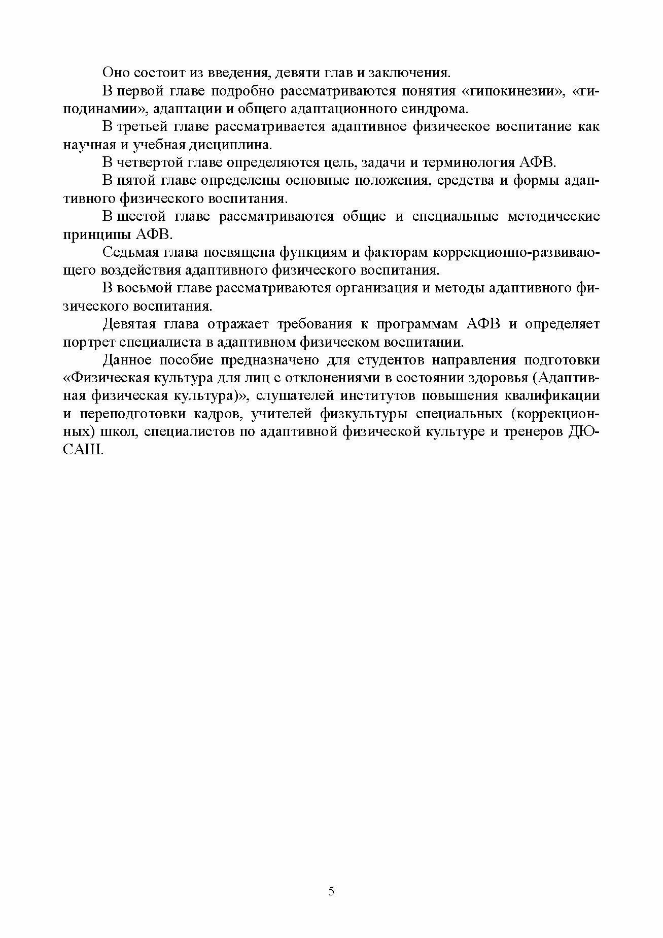 Учебное пособие направлено на формирования теоретических и методических знаний и умений у бакалавров и слушателей институтов повышения квалификации и переподготовки кадров в рамках профиля «Адаптивное физическое воспитание» предусмотренной ФГОС ВО по направлению подготовки «Физическая культура для лиц с отклонениями в состоянии здоровья (Адаптивная физическая культура)». В нем раскрывается содержание теоретико-методических и организационно-педагогических аспектов адаптивного физического воспитания лиц с отклонениями в состоянии здоровья, которое формирует целостное представление о содержании средств, форм и методов адаптивного физического воспитания в структуре образовательного процесса, организации физкультурно-оздоровительных и спортивных программ различного уровня и дает конкретное представление о роли и месте адаптивного физического воспитания в системе комплексной реабилитации и социальной адаптации лиц с отклонениями в состоянии здоровья. Учебное пособие предназначено для студентов высших учебных заведений, обучающихся по направлению подготовки «Физическая культура для лиц с отклонениями в состоянии здоровья (Адаптивная физическая культура)», слушателей курсов повышения квалификации институтов повышения квалификации и переподготовки кадров, а также для специалистов и работников органов управления общим и специальным образованием, общеобразовательных и специальных (коррекционных) образовательных учреждений, учреждений системы социальной защиты, общественных объединений и организаций, занимающихся организацией физкультурно-оздоровительной работы с лицами с отклонениями в состоянии здоровья.