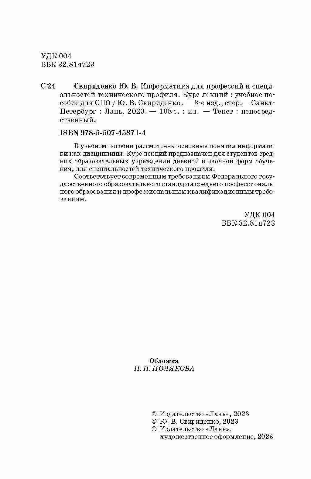 Информатика для профессий и специальностей технического профиля. Курс лекций (Свириденко Юлия Валерьевна); Лань, 2021