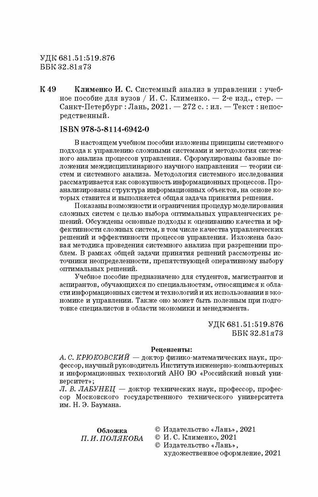 Системный анализ в управлении (Игорь Семенович Клименко); Издательство ЛАНЬ, 2021