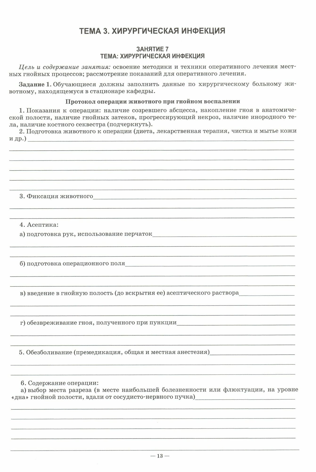 Рабочая тетрадь по общей и частной хирургии предназначена для самостоятельной работы обучающихся во внеаудиторное время, что будет способствовать развитию у них врачебного мышления. Кроме того, рабочая тетрадь позволяет более эффективно реализовывать в учебном процессе активные формы обучения и повысить уровень самостоятельной работы студентов по указанным темам данной специальной дисциплины. Рабочая тетрадь составлена в соответствии с ФГОС ВО по специальности «Ветеринария».