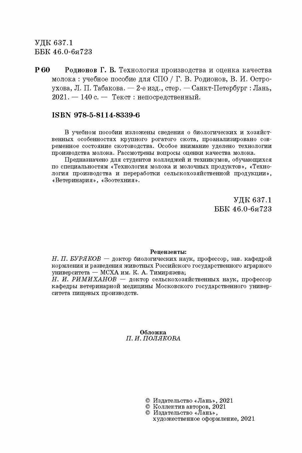 Технология производства и оценка качества молока (Родионов Геннадий Владимирович, Остроухова Вера Ивановна, Табакова Лилия Петровна); Лань, 2021