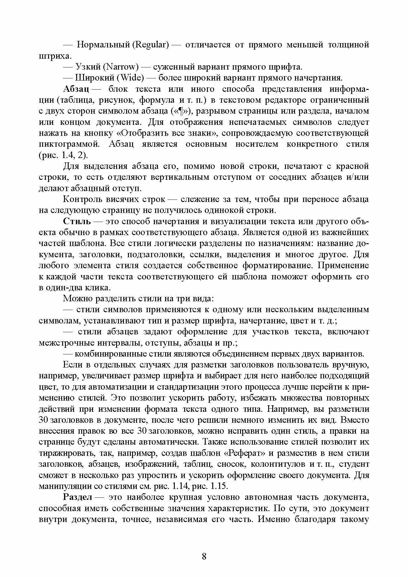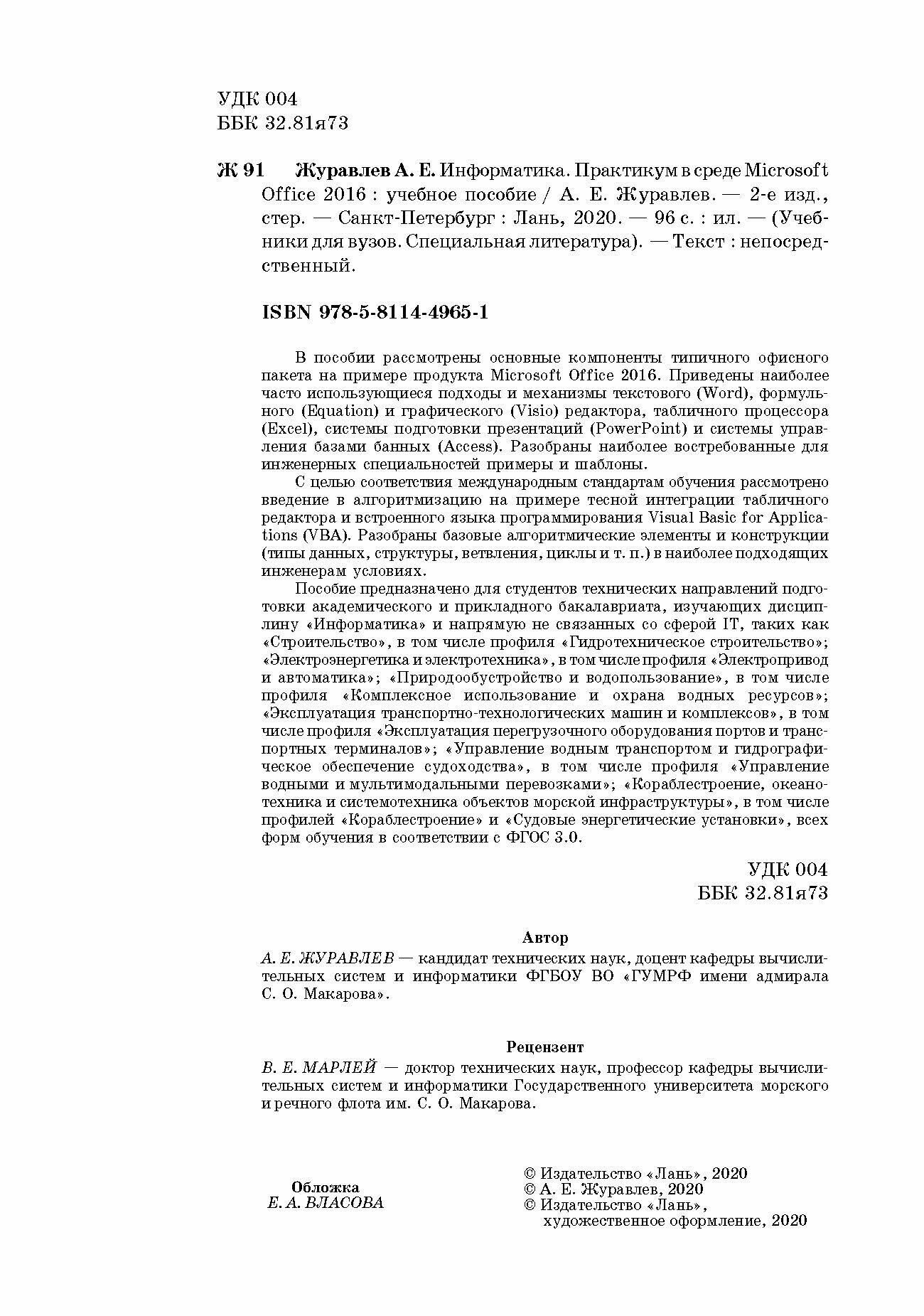 В пособии рассмотрены основные компоненты типичного офисного пакета на примере продукта Microsoft Office 2016. Приведены наиболее часто использующиеся подходы и механизмы текстового (Word), формульного (Equation) и графического (Visio) редактора, табличного процессора (Excel), системы подготовки презентаций (PowerPoint) и системы управления базами банных (Access). Разобраны наиболее востребованные для инженерных специальностей примеры и шаблоны. С целью соответствия международным стандартам обучения рассмотрено введение в алгоритмизацию на примере тесной интеграции табличного редактора и встроенного языка программирования Visual Basic for Applications (VBA). Разобраны базовые алгоритмические элементы и конструкции (типы данных, структуры, ветвления, циклы и т. п.) в наиболее подходящих инженерам условиях. Пособие предназначено для студентов технических направлений подготовки академического и прикладного бакалавриата, изучающих дисциплину «Информатика» и напрямую не связанных со сферой IT, таких как «Строительство», в том числе профиля «Гидротехническое строительство», «Электроэнергетика и электротехника», в том числе профиля «Электропривод и автоматика», «Природообустройство и водопользование», в том числе профиля «Комплексное использование и охрана водных ресурсов», «Эксплуатация транспортно-технологических машин и комплексов», в том числе профиля «Эксплуатация перегрузочного оборудования портов и транспортных терминалов», «Управление водным транспортом и гидрографическое обеспечение судоходства», в том числе профиля «Управление водными и мультимодальными перевозками», «Кораблестроение, океанотехника и системотехника объектов морской инфраструктуры», в том числе профилей «Кораблестроение» и «Судовые энергетические установки», всех форм обучения в соответствии с ФГОС 3.0.