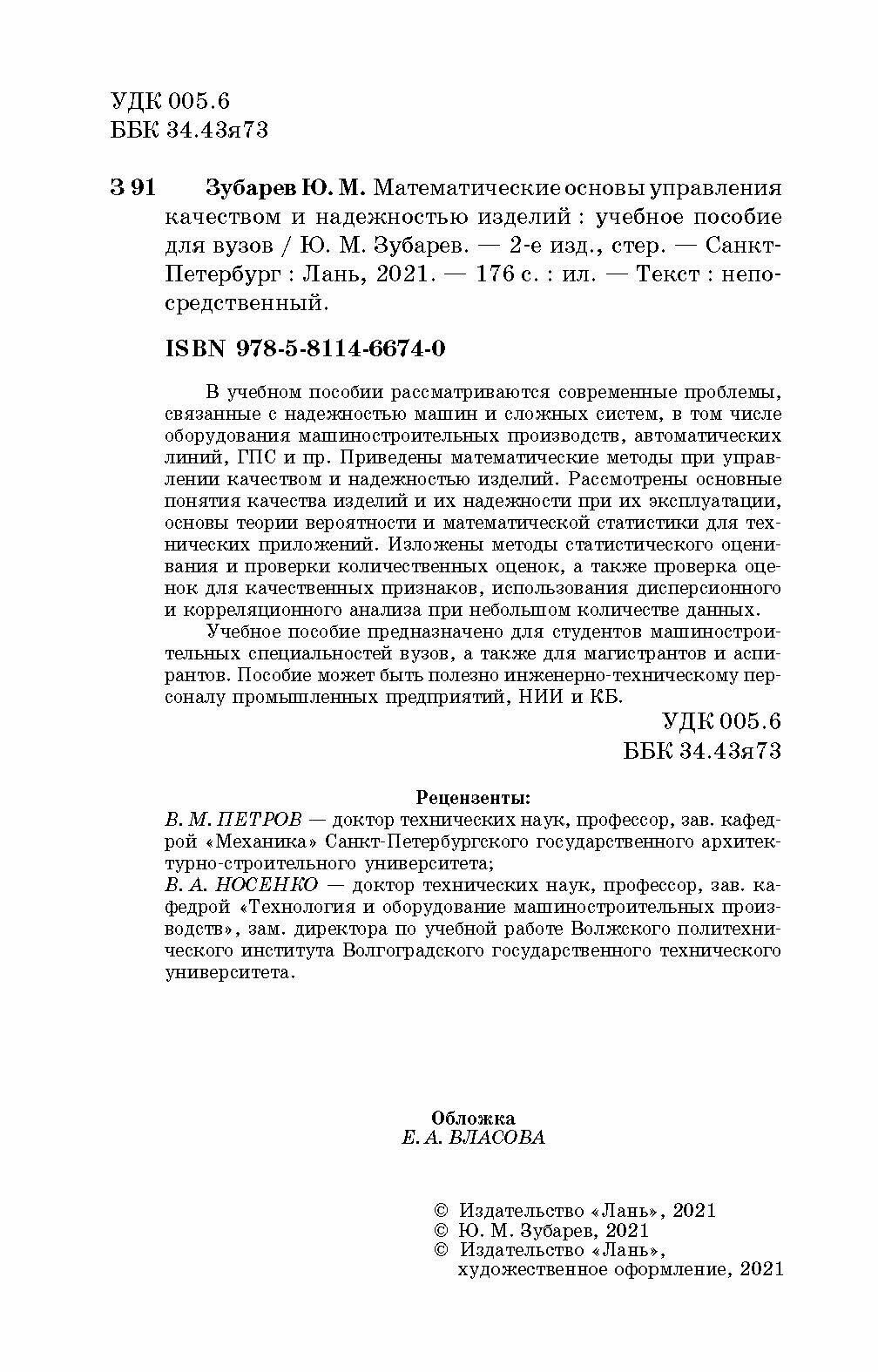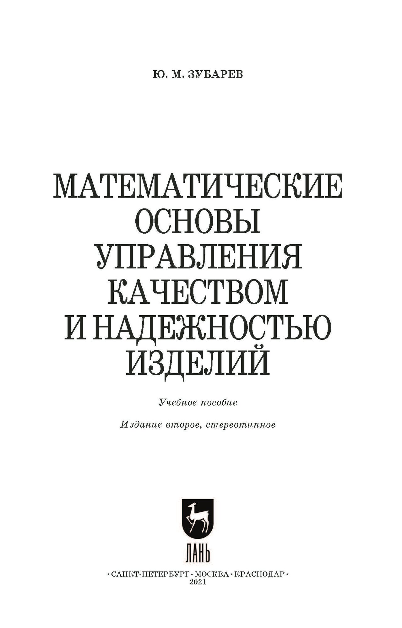 Математические основы управления качеством и надежностью изделий (Ю. М. Зубарев); Издательство ЛАНЬ, 2021