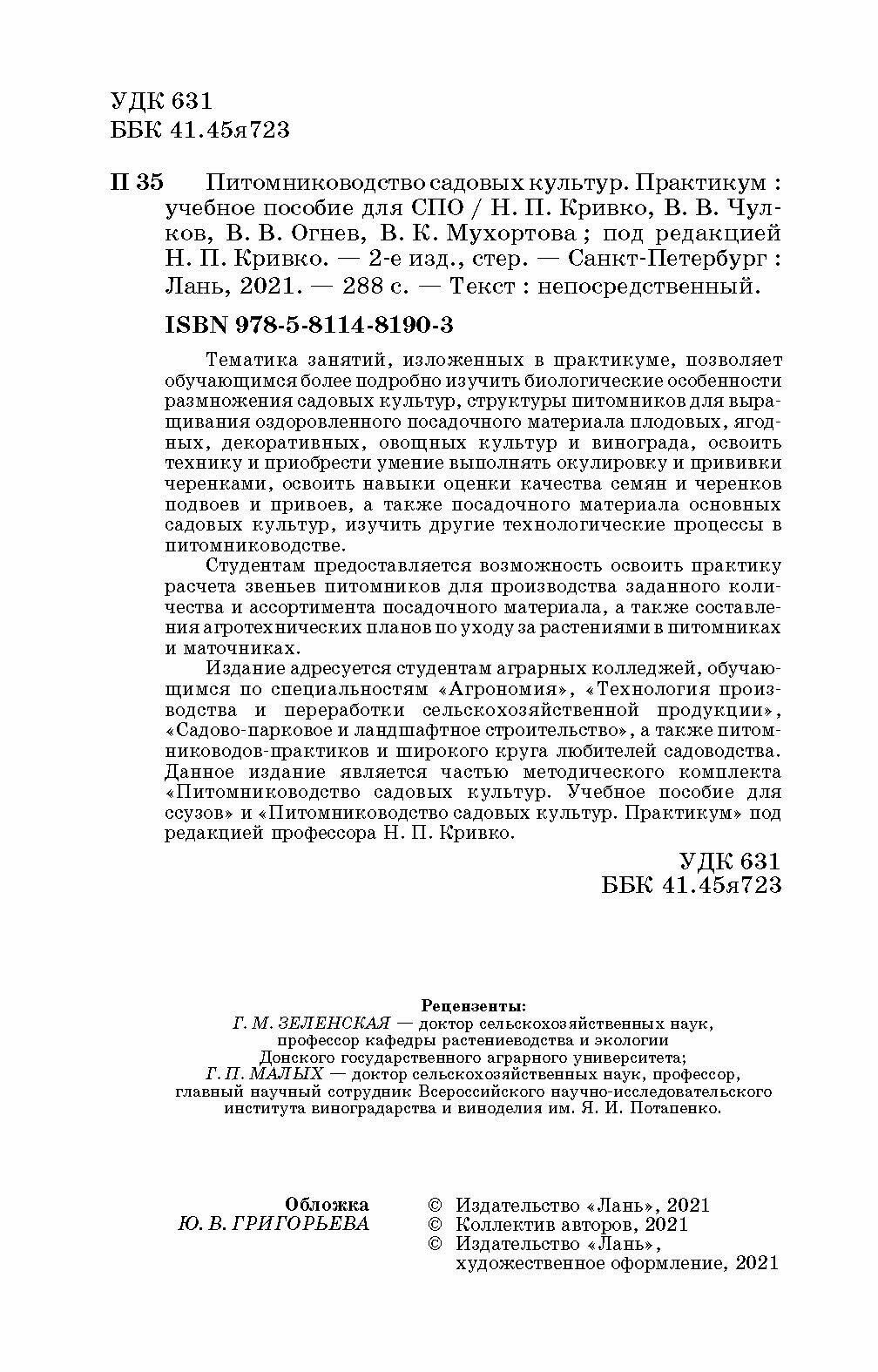 Питомниководство садовых культур. Практикум (Кривко Николай Павлович, Чулков Владимир Викторович, Огнев Валерий Владимирович, Мухортова Вера Константиновна); Лань, 2021