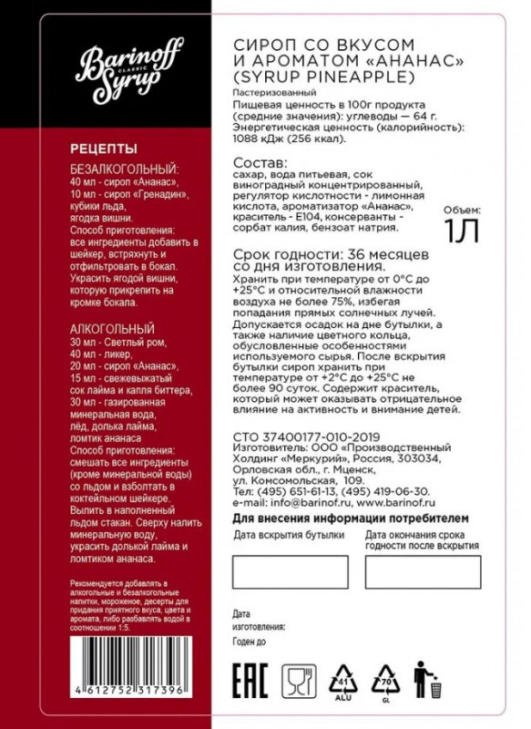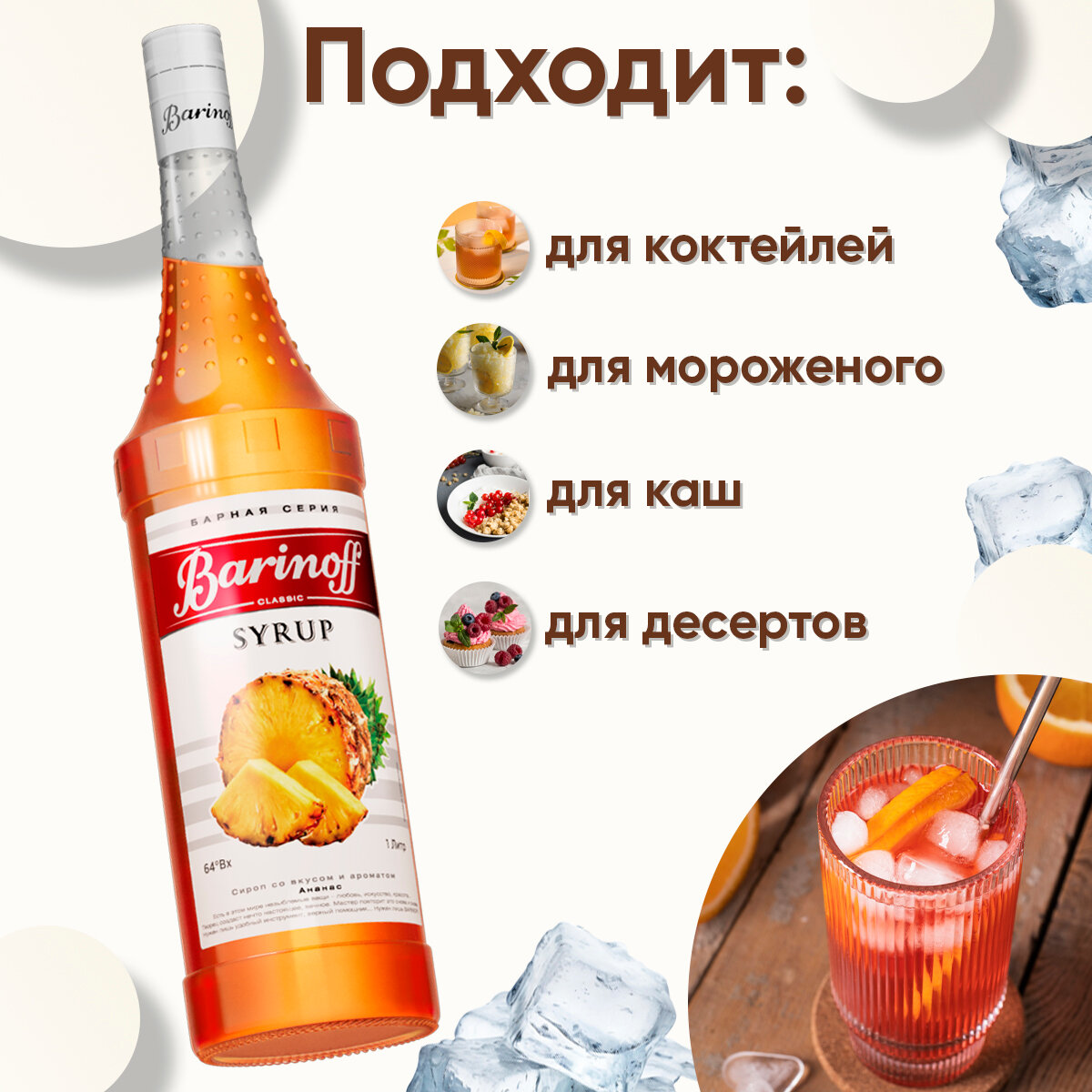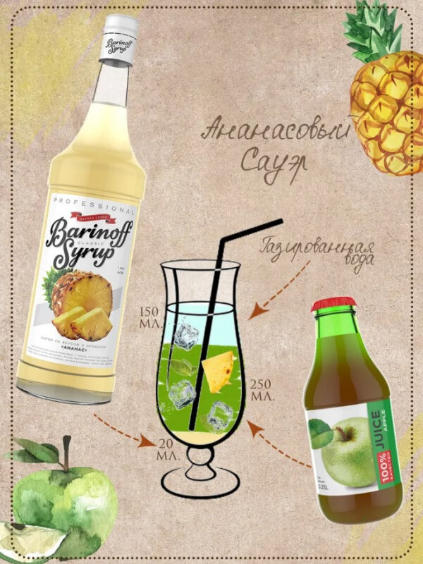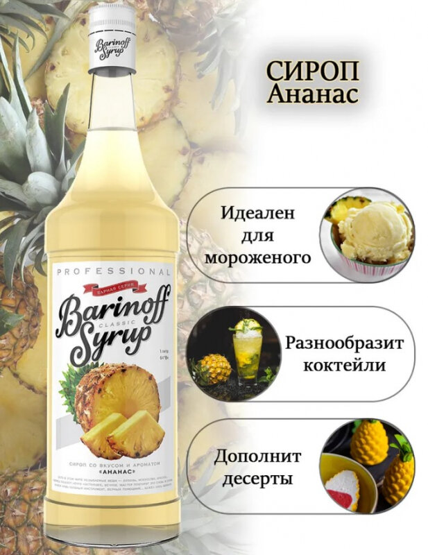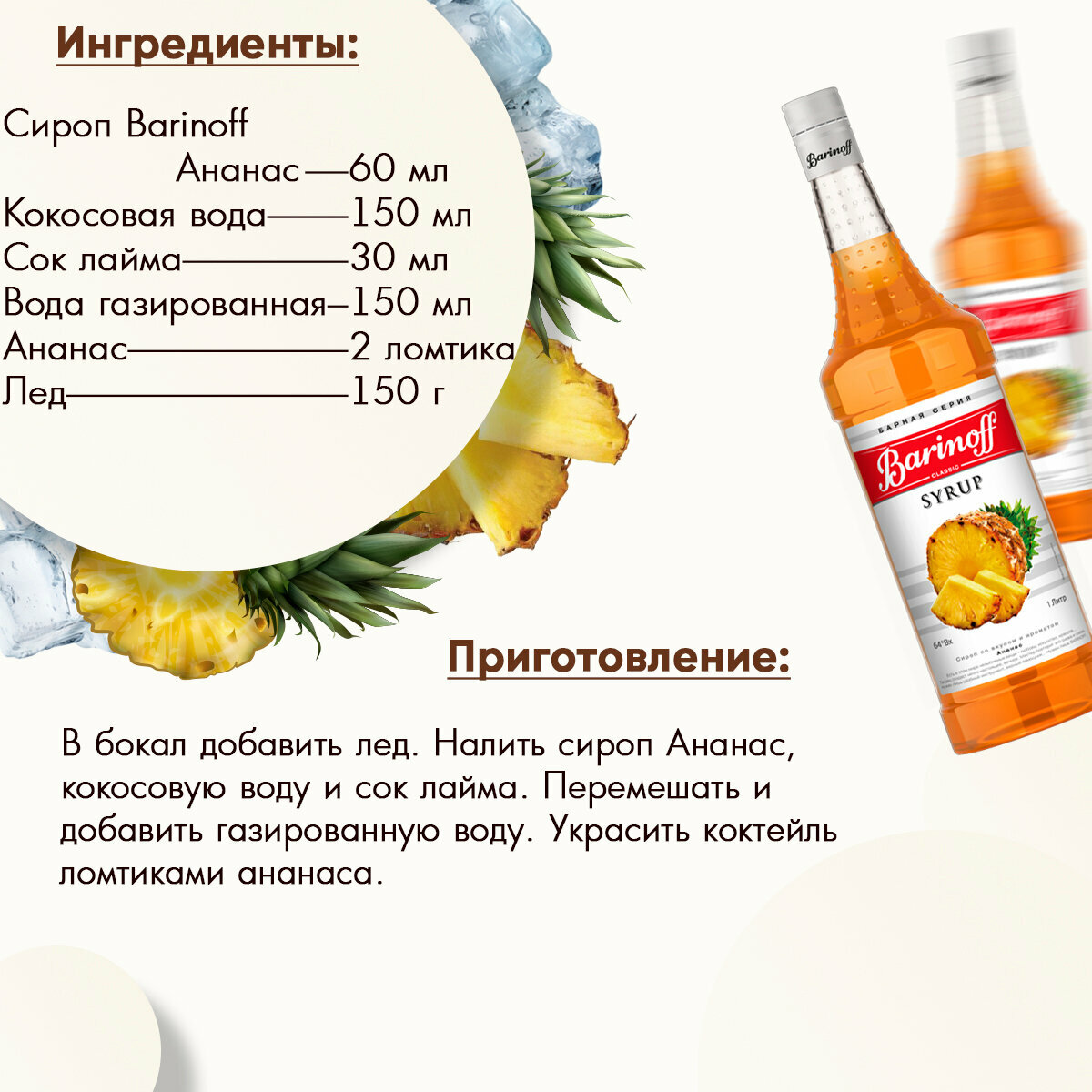 Сироп Barinoff Ананас - это яркий вкус солнца и удивительный гавайский подарок. Ананасовый сироп отличается неповторимым сладковато-пряным ароматом и насыщенным вкусом с отчетливыми тонами спелого тропического фрукта и едва заметной кислинкой. Бесподобный букет ананасового сиропа придется по вкусу всем поклонникам сладких фруктовых добавок. Это яркое лакомство цвета золота широко используется во многих сферах, в том числе в кофейной индустрии, кулинарии и т.д. Приятная тягучая консистенция продукта позволяет применять его в качестве украшения для разнообразных сладких блюд и десертов. Мороженое, лимонад, охлажденный чай и даже простая газировка, благодаря сиропу Ананас, превратятся в настоящие кулинарные шедевры. Для сиропа подходят дозаторы диаметром 31 мм.