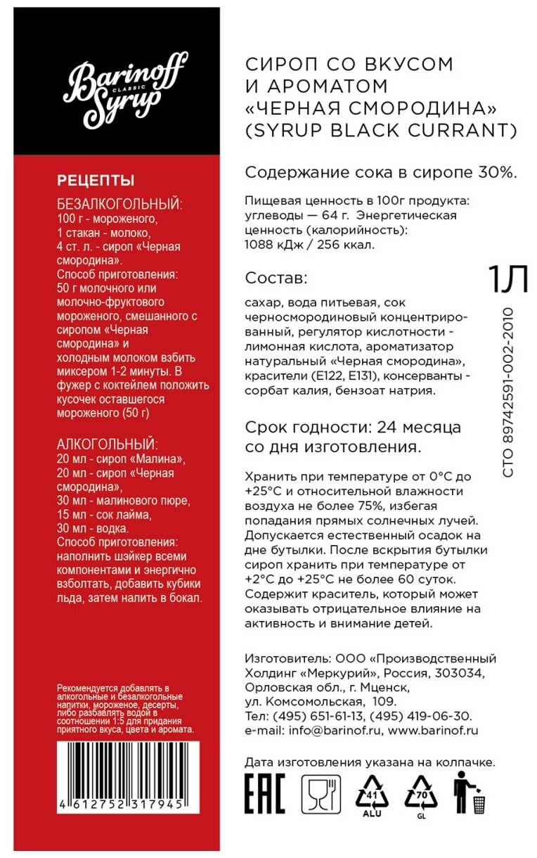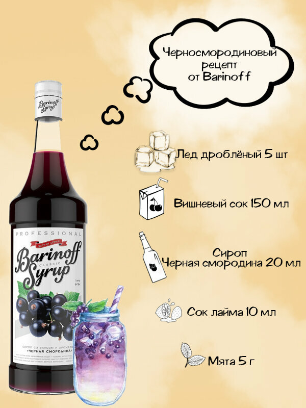 Сироп Barinoff Черная смородина изготавливают из черносмородинового сока и родниковой воды и сахара. Имеет характерный бордовый цвет, в аромате чувствуются душистые нотки спелых ягод смородины, сладкий и обволакивающий вкус очаровывает акцентами черной смородины с легкой кислинкой в послевкусии. Благодаря восхитительным органолептическим свойствам, этот сироп наделит чай или кофе особенной изюминкой. Помимо этого, черносмородиновый напиток – идеальная добавка во фруктовые салаты, всевозможные десерты, мороженое, торты и пирожные. Для сиропа подходят дозаторы диаметром 31 мм.