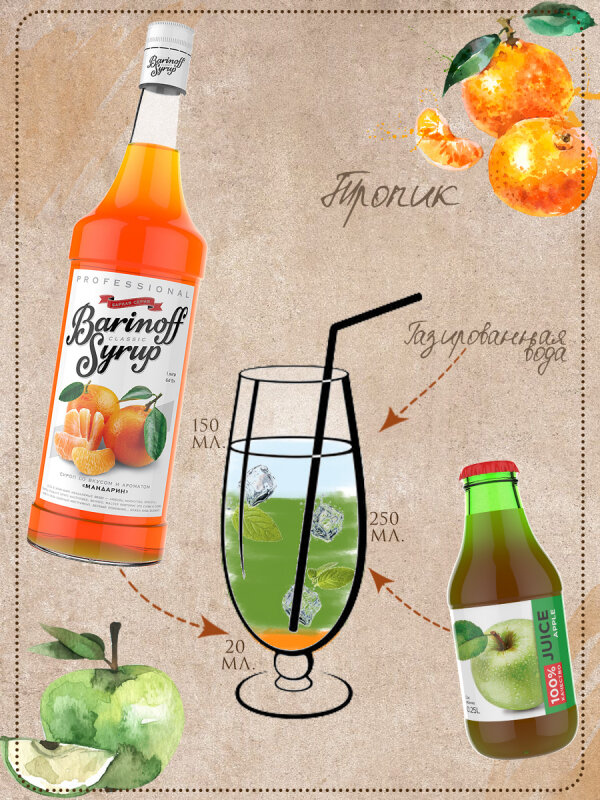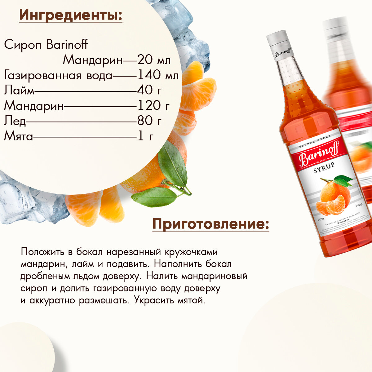 Сироп Barinoff Мандарин это ароматная добавка, которая подарит любому блюду или напитку свежий и яркий аромат цитрусовых. Мандариновый сироп навевает теплые ассоциации с праздником. Его аромат — это запах Нового года, яркое ощущение праздника. Мандариновый сироп можно использовать в качестве добавки в самые различные напитки и десерты, а также украшать всевозможную выпечку. Для сиропа подходят дозаторы диаметром 31 мм.