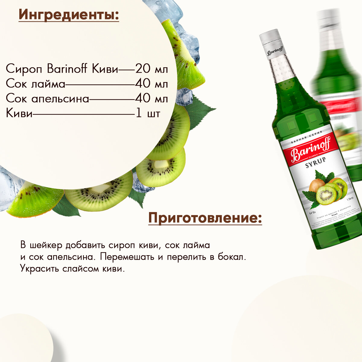 Сироп Barinoff Киви создан, чтобы дарить позитивные эмоции и эстетическое удовольствие. Ярко-зеленый цвет, волшебный аромат и насыщенный вкус. Сироп из киви не имеет аналогов во всем царстве сладких фруктово-ягодных добавок. Благодаря неповторимому вкусу и аромату, данный продукт часто используется в кулинарии как пропитка для коржей и сладкой выпечки, сироп прекрасно сочетается с другими напитками, в том числе с лимонадом, газировкой или холодным чаем. Экзотическое вкусовое сочетание можно получить путем добавления сиропа в горячий кофе или любой кофейный напиток, с его помощью готовят неповторимые алкогольные и безалкогольные коктейли. Для сиропа подходят дозаторы диаметром 31 мм.