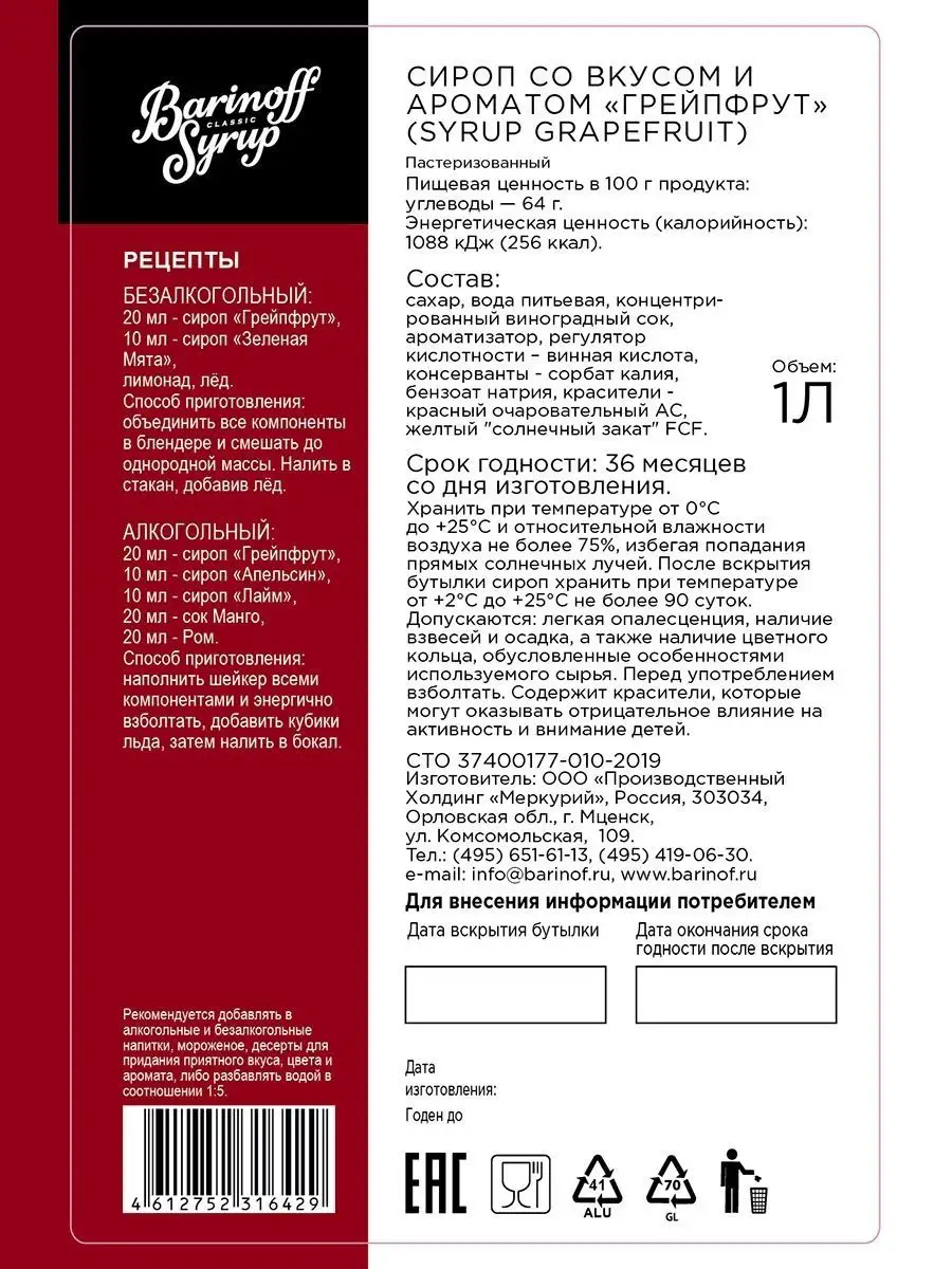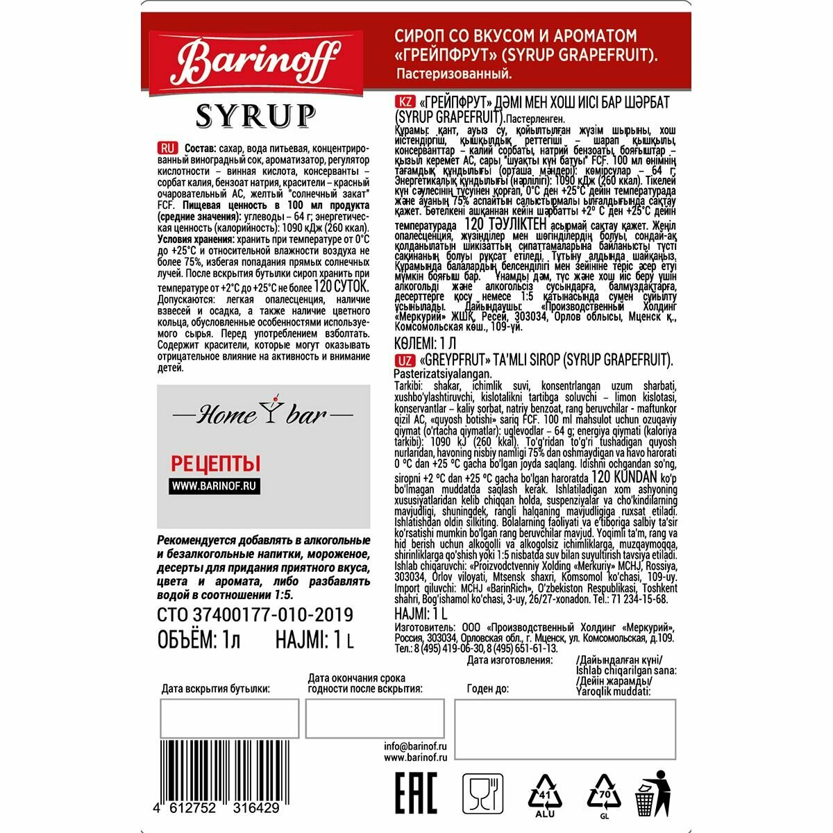 Сироп Barinoff Грейпфрут является излюбленным лакомством многих сладкоежек. Он производится на основе натурального сырья - фруктового сока грейпфрута - с использованием очищенной воды. Фруктовый сироп Грейпфрут характеризуется высоким содержанием сахара, что положительно сказывается на сроке хранения продукта и исключает возможность брожения. Именно поэтому грейпфрутовый сироп широко применяется в сфере HoReCa в качестве ароматической добавки для кофейных напитков, холодного чая, лимонада, содовой и т. д. Грейпфрутовый сироп также участвует в смешивании разнообразных прохладительных напитков и алкогольных коктейлей. По словам профессионалов, он особенно хорош в дуэте с вермутом. Натуральный грейпфрутовый сироп имеет насыщенный темно - янтарный цвет, восхитительный фруктово - цитрусовый аромат и легкую горчинку. Для сиропа подходят дозаторы диаметром 31 мм.