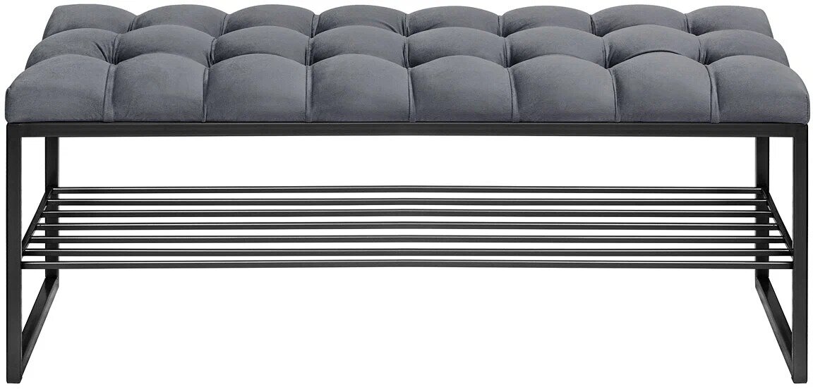 Банкетка RUBY с черным основанием и мягкой велюровой подушкой с каретной стяжкой.Характеристики банкетки RUBY:• размеры: (длина х ширина х высота) 1100 х 400 х 450 мм,• вес – 12,2 кг,• высота подушки — 80 мм,• обивка — искусственный велюр, • наполнитель — пенополиуретан,• максимальная нагрузка — 120 кг.Основание банкетки изготовлено из стали с полимерным покрытием. Собственное производство обеспечивает надежность и эстетику сварных швов металлической мебели.Банкетка с велюровой подушкой отличается элегантным видом и комфортной посадкой. Мягкая обивка с высокой износостойкостью, прошла тест Мартиндейла — 35 000 циклов.Бархатистая ткань легко чистится от загрязнений, для ухода разрешена сухая и влажная чистка. Стильная банкетка подойдет для прихожей, спальни, гостиной и кабинета.Банкетка лофт добавит изысканности интерьеру квартиры, офиса, салона и загородного дома. Банкетка отлично сочетается со стеллажами LOFT.Банкетку доставляем в собранном виде в надежной упаковке.