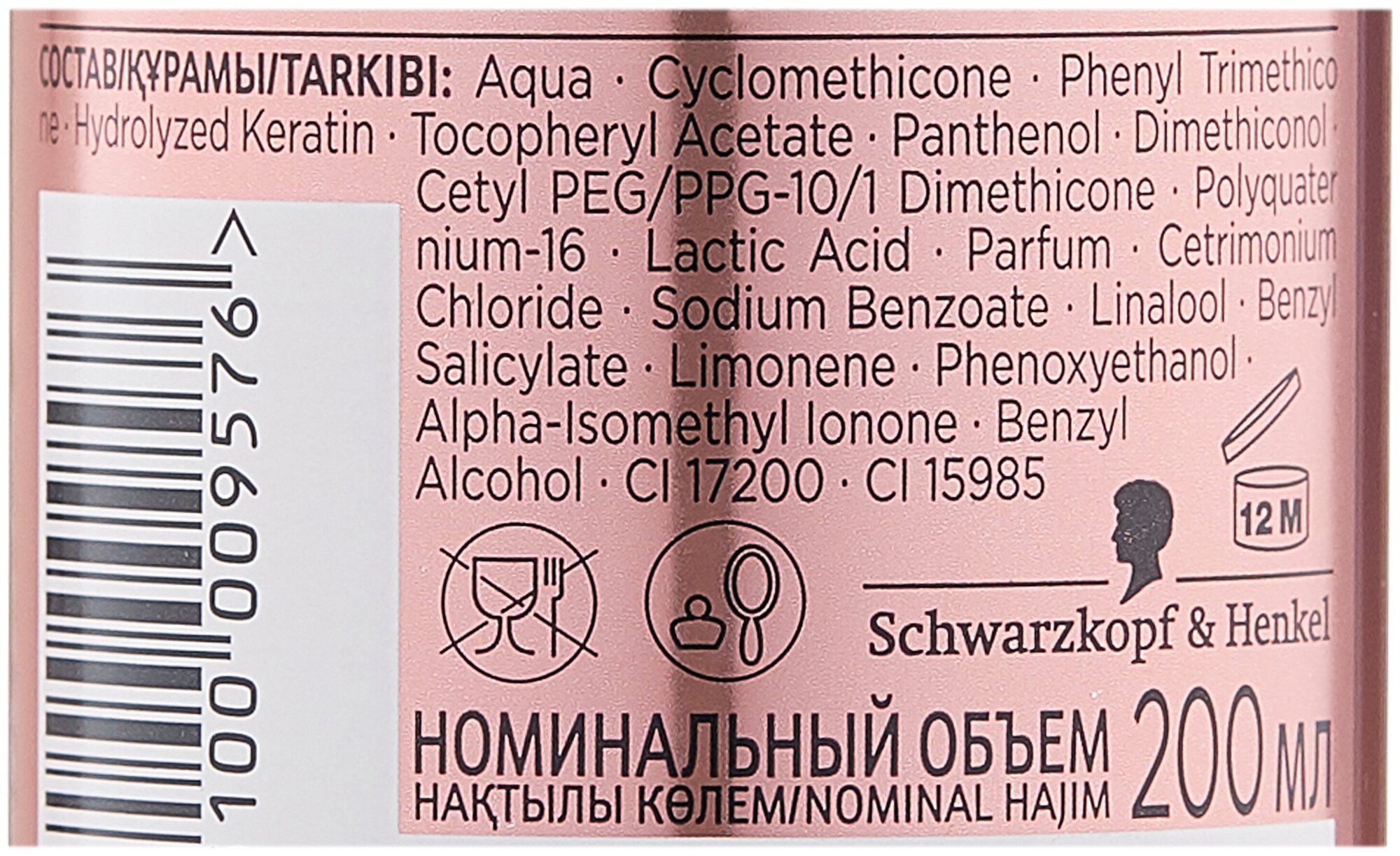| Состав | aqua, cyclomethicone, phenyl trimethicone, hydrolyzed keratin, tocopheryl acetate, panthenol, dimethiconol, cetyl peg / ppg-10/1 dimethicone, polyquaternium-16, lactic acid, parfum, cetrimonium chloride, sodium benzoate, linalool, benzyl salicylate, limonene, phenoxyethanol, alpha-isomethyl ionone, benzyl alcohol, ci 17200, ci 15985 |