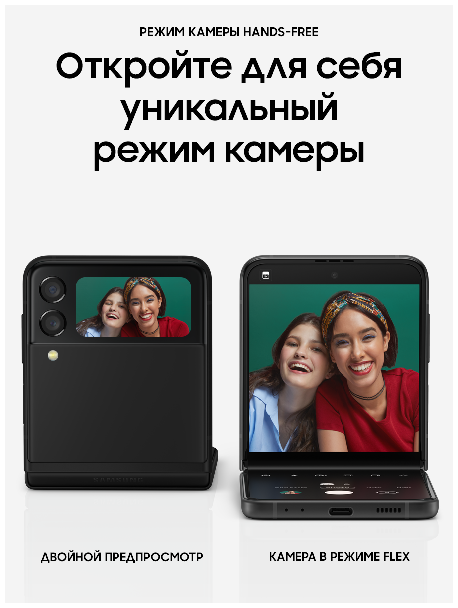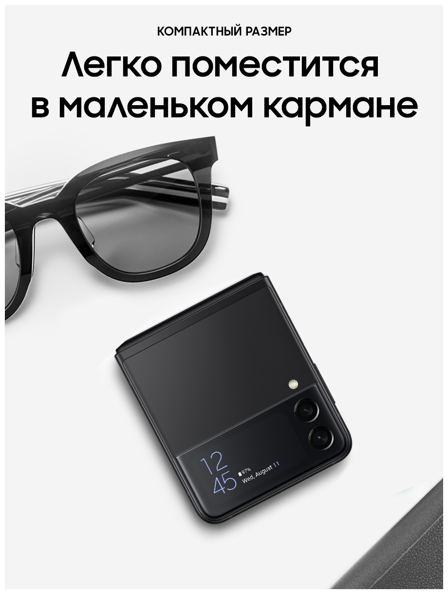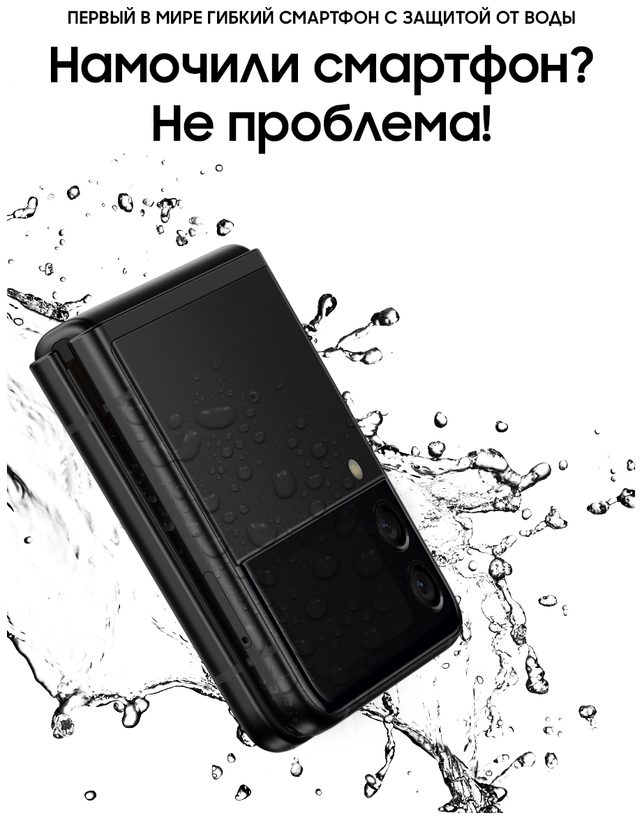 ХОРОШЕЕ СТАЛО ЕЩЕ ЛУЧШЕ Он легко поместится в карман, сумочку или в самые узкие джинсы. А после, вы можете достать его и открыть или согнуть под нужным вам углом. Если вам показалось, что Samsung бросили вызов стандартным смартфонам, вам не показалось. Samsung действительно сделали это! ЦВЕТОВАЯ ПАЛИТРА НА ЛЮБОЙ ВКУС Хотите добавить ярких красок или предпочитаете классический черный? Galaxy Z Flip3 5G отличается стильным дизайном и вдохновляющими цветами, которые придутся по вкусу каждому. А какой оттенок выберете вы? СМАРТФОН, В КОТОРОМ ПОМЕЩАЕТСЯ ВСЕ, ЛЕГКО ПОМЕСТИТСЯ ДАЖЕ В МАЛЕНЬКОМ КАРМАНЕ Полноразмерный смартфон, размеры которого в сложенном виде всего 4,2 дюйма, в таком виде он поместится даже в небольшой карман. ВНЕШНИЙ ЭКРАН ДЛЯ САМОГО ВАЖНОГО Проверяйте сообщения, делайте фотографии, воспроизводите музыку и многое другое, не открывая смартфон. 1,9-дюймовый внешний экран отображает уведомления и позволяет с ними взаимодействовать. Выберите необходимые параметры для легкого доступа, а затем настройте их отображение под свой вкус, используя разные стили и цвета. ПРИТЯГИВАЕТ ВЗГЛЯД ,7-дюймовый экран Infinity Flex с частотой обновления кадров 120 Гц обеспечивает невероятно плавную прокрутку контента, возможность использования жестов смахивания и перетаскивания объектов. Кроме того, частота обновления экрана адаптируется под просматриваемый контент. А в сочетании с матрицей Dynamic AMOLED 2X экран Galaxy Z Flip3 5G становится не только самым плавным, но и самым ярким за всю историю Galaxy Z. ВНЕШНИЙ ЭКРАН С СЕЛФИ Нет времени раскрывать смартфон? Делайте селфи на двойную основную камеру, а предварительный просмотр снимков будет доступен на внешнем экране. Просто нажмите кнопку громкости сбоку, чтобы спустить затвор. СНИМАЙТЕ ПОД ЛЮБЫМ УГЛОМ Съемка селфи изменилась к лучшему. Теперь снимать фото и видео в режиме Flex стало легче, чем раньше. Все, что вам нужно сделать, это отрегулировать угол и сделать шаг назад для селфи без помощи рук. ПРИГОТОВИЛИСЬ? ВПЕРЕД! Сделайте ускоренные видео своей фишкой. Положите Galaxy Z Flip3 5G на плоскую поверхность, и режим Flex будет работать как штатив, удерживая угол для стабилизации камеры, чтобы сделать снимок с первого дубля. ДО ДВУХ ПРИЛОЖЕНИЙ ОДНОВРЕМЕННО Разделите экран на две части и выполняйте несколько задач одновременно. Вы можете посмотреть свой плейлист на YouTube и написать другу, а затем отправить потрясающее селфи. При просмотре видео наслаждайтесь реалистичным звуком с эффектом полного погружения благодаря поддержке Dolby Atmos и стереодинамиками. НАМОЧИЛИ СМАРТФОН? НЕ ПРОБЛЕМА! Ощутите настоящий всплеск эмоций с первым в мире гибким смартфоном с защитой от воды по стандарту: IPX8. Он может находиться в воде на глубине 1,5 метра до 30 минут.