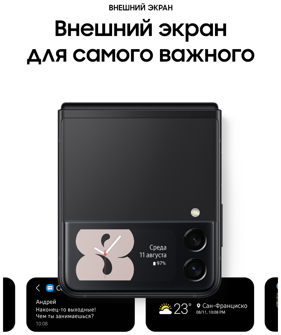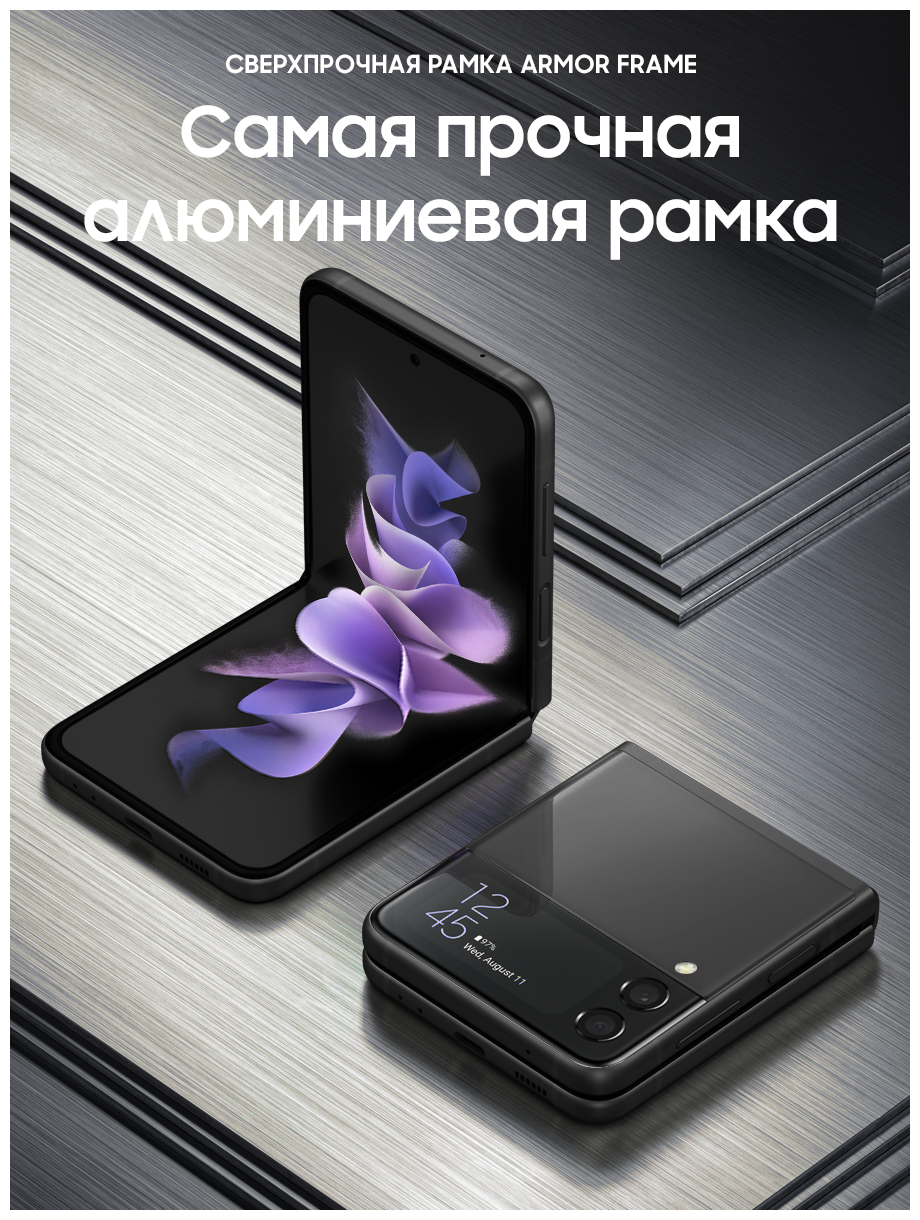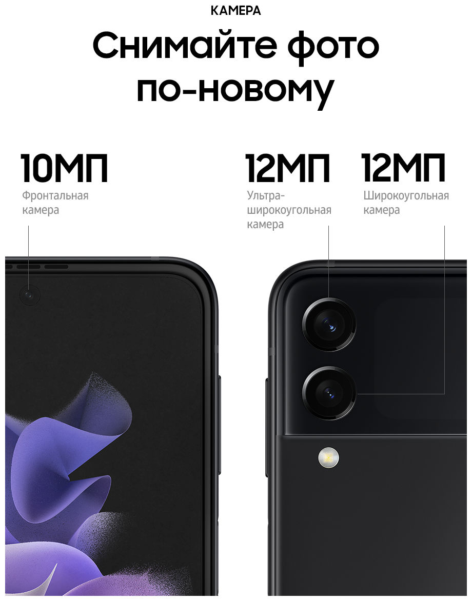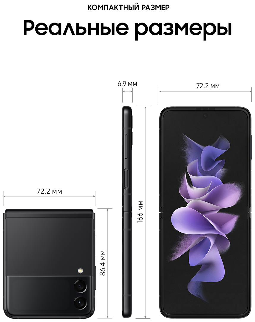 ХОРОШЕЕ СТАЛО ЕЩЕ ЛУЧШЕ Он легко поместится в карман, сумочку или в самые узкие джинсы. А после, вы можете достать его и открыть или согнуть под нужным вам углом. Если вам показалось, что Samsung бросили вызов стандартным смартфонам, вам не показалось. Samsung действительно сделали это! ЦВЕТОВАЯ ПАЛИТРА НА ЛЮБОЙ ВКУС Хотите добавить ярких красок или предпочитаете классический черный? Galaxy Z Flip3 5G отличается стильным дизайном и вдохновляющими цветами, которые придутся по вкусу каждому. А какой оттенок выберете вы? СМАРТФОН, В КОТОРОМ ПОМЕЩАЕТСЯ ВСЕ, ЛЕГКО ПОМЕСТИТСЯ ДАЖЕ В МАЛЕНЬКОМ КАРМАНЕ Полноразмерный смартфон, размеры которого в сложенном виде всего 4,2 дюйма, в таком виде он поместится даже в небольшой карман. ВНЕШНИЙ ЭКРАН ДЛЯ САМОГО ВАЖНОГО Проверяйте сообщения, делайте фотографии, воспроизводите музыку и многое другое, не открывая смартфон. 1,9-дюймовый внешний экран отображает уведомления и позволяет с ними взаимодействовать. Выберите необходимые параметры для легкого доступа, а затем настройте их отображение под свой вкус, используя разные стили и цвета. ПРИТЯГИВАЕТ ВЗГЛЯД ,7-дюймовый экран Infinity Flex с частотой обновления кадров 120 Гц обеспечивает невероятно плавную прокрутку контента, возможность использования жестов смахивания и перетаскивания объектов. Кроме того, частота обновления экрана адаптируется под просматриваемый контент. А в сочетании с матрицей Dynamic AMOLED 2X экран Galaxy Z Flip3 5G становится не только самым плавным, но и самым ярким за всю историю Galaxy Z. ВНЕШНИЙ ЭКРАН С СЕЛФИ Нет времени раскрывать смартфон? Делайте селфи на двойную основную камеру, а предварительный просмотр снимков будет доступен на внешнем экране. Просто нажмите кнопку громкости сбоку, чтобы спустить затвор. СНИМАЙТЕ ПОД ЛЮБЫМ УГЛОМ Съемка селфи изменилась к лучшему. Теперь снимать фото и видео в режиме Flex стало легче, чем раньше. Все, что вам нужно сделать, это отрегулировать угол и сделать шаг назад для селфи без помощи рук. ПРИГОТОВИЛИСЬ? ВПЕРЕД! Сделайте ускоренные видео своей фишкой. Положите Galaxy Z Flip3 5G на плоскую поверхность, и режим Flex будет работать как штатив, удерживая угол для стабилизации камеры, чтобы сделать снимок с первого дубля. ДО ДВУХ ПРИЛОЖЕНИЙ ОДНОВРЕМЕННО Разделите экран на две части и выполняйте несколько задач одновременно. Вы можете посмотреть свой плейлист на YouTube и написать другу, а затем отправить потрясающее селфи. При просмотре видео наслаждайтесь реалистичным звуком с эффектом полного погружения благодаря поддержке Dolby Atmos и стереодинамиками. НАМОЧИЛИ СМАРТФОН? НЕ ПРОБЛЕМА! Ощутите настоящий всплеск эмоций с первым в мире гибким смартфоном с защитой от воды по стандарту: IPX8. Он может находиться в воде на глубине 1,5 метра до 30 минут.