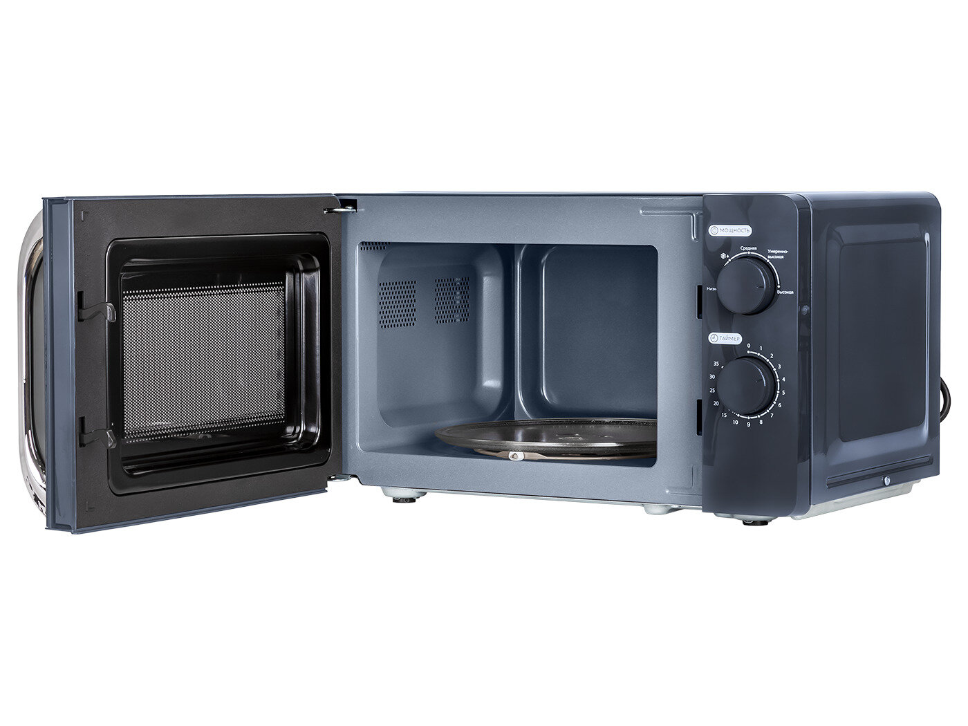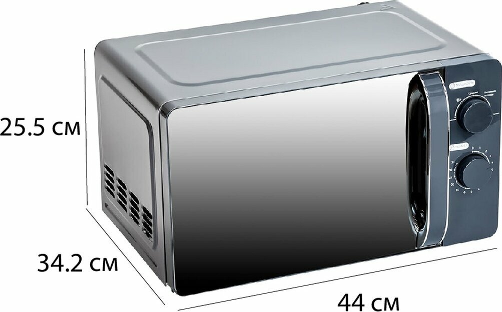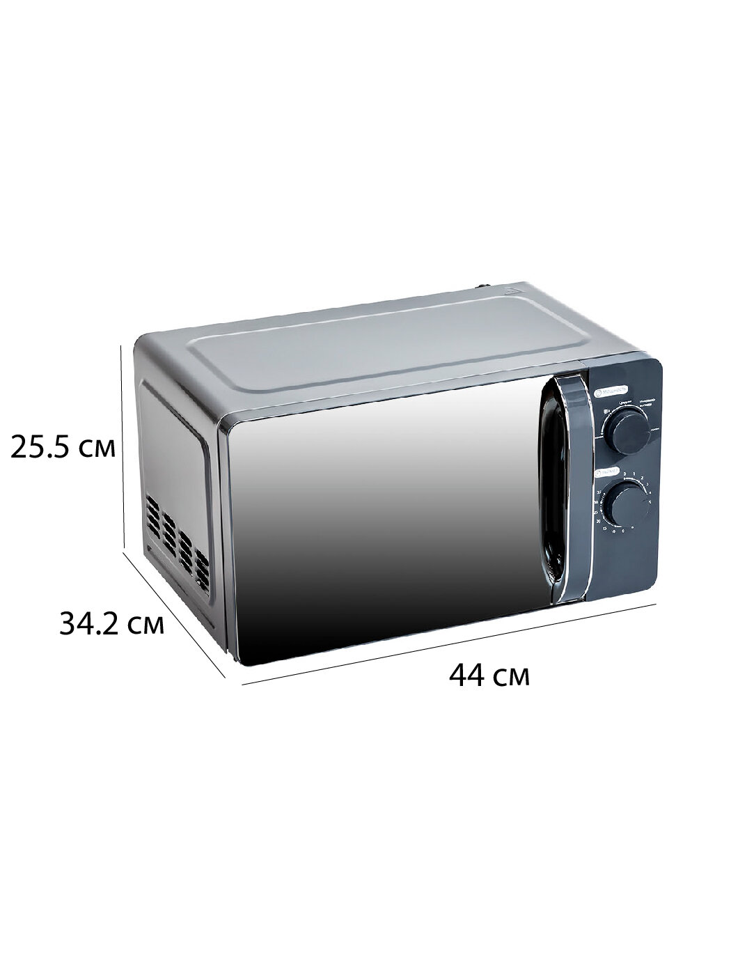 Таймер времени дает возможность установить время приготовления до 35 мин. Звуковой сигнал оповестит о готовности. Вращение пищи во время работы печи способствует ее равномерному приготовлению. Диаметр поворотного стола 24,5 см, дверь открывается при помощи эргономичной ручки. Микроволновая печь изготовлена из металла, внутреннее покрытие камеры выполнено из жаропрочной эмали.