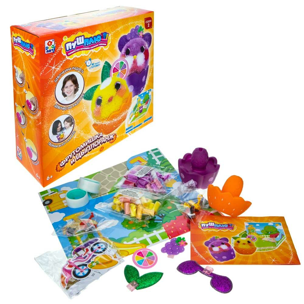 «Пуш-Плюш. Фрутомишка и Цыплоранж» 1Toy Т20739 - это великолепный набор для творчества, с помощью которого можно сделать пушистую игрушку своими руками! В набор входит пластмассовая основа-игрушка, к которой при помощи специальных стикеров крепятся разноцветные меховые капсулы. В цветной инструкции представлена подробная схема. Можно крепить капсулы по инструкции или экспериментировать с палитрой и создавать свою комбинацию цветов. В комплект входит оригинальный аксессуар. Набор развивает творческое мышление, воображение и мелкую моторику.Состав комплекта: основа игрушки (2 шт.), меховые капсулы (66 шт.), уши (2 пары), глаза (2 пары), нос (2 шт.), лента с двусторонними стикерами (2 шт.), аксессуары (2 шт.), складная "игровая площадка" (1 шт.), инструкция.Характеристики:Возраст: от 6 лет.Пол: девочки.Материал: полимерные материалы, текстиль, бумага.Тип упаковки: картонная коробка.Размеры упаковки: 27 х 10 х 29 см.Вес в упаковке: 0,69 кг.Бренд: 1Toy.Страна бренда: Россия.