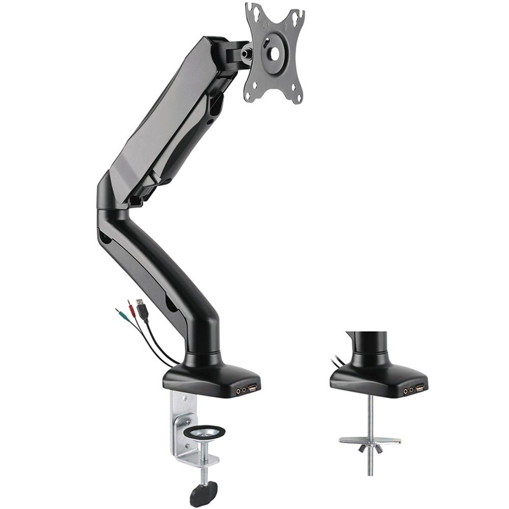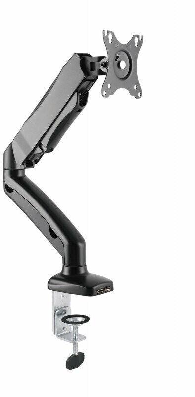 | Дополнительно | Надёжный алюминиевый кронштейн для монитора с газлифтофым механизмом подходит для мониторов с диагональю от 17 до 32 дюймов и выдерживает нагрузку до 6 кг, что позволяет легко размещать даже самые большие и тяжелые мониторы. Перемещение монитора вверх, вниз, вперед и назад осуществляется с легким усилием.,Газлифт идеально уравновешивает вес монитора,Подходит для мониторов 17-32 дюйма,Два варианта установки:настольный зажим и втулка (входят в комплект) |