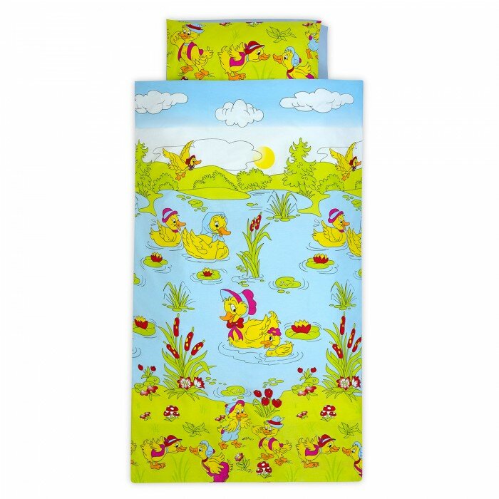 Наволочка, пододеяльник и простынь выполнены в приятной цветовой гамме, украшены изображениями уточек.