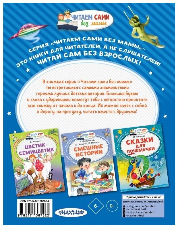 Оформление книги, пожалуй, понравилось. Страницы плотные белые, буквы крупные с ударением. Картинок очень много. Единственное, конечно, слишком уж современные герои на картинках, девочка с блестящими губами, профессор Селезнёв выглядит, скорее, как мажор, а не привычный мне с детства герой рисунков Мигунова)) но я думаю, здесь нужно мнение ребёнка учитывать, а ему всё понравилось. Картинки весёлые, просто я немного ностальгирую))