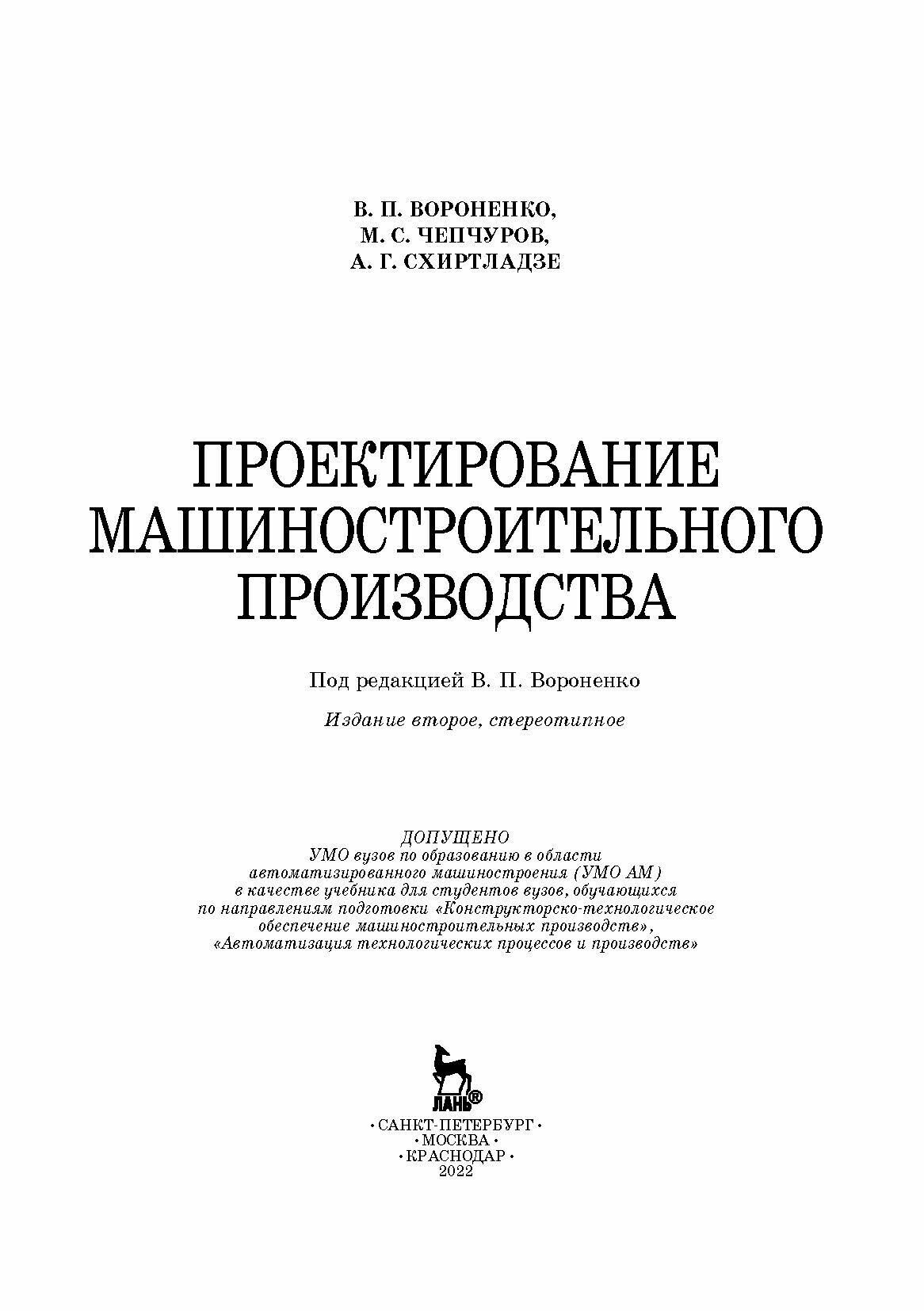 Проектирование машиностроительного производства (Вороненко Владимир Павлович, Чепчуров Михаил Сергеевич, Схиртладзе Александр Георгиевич); Лань, 2019