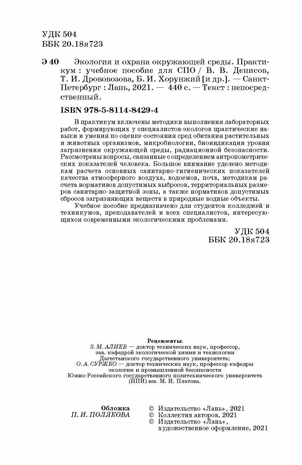 Экология и охрана окружающей среды. Практикум (Денисов Владимир Викторович, Хорунжий Борис Иванович, Дрововозова Татьяна Ильинична); Лань, 2021