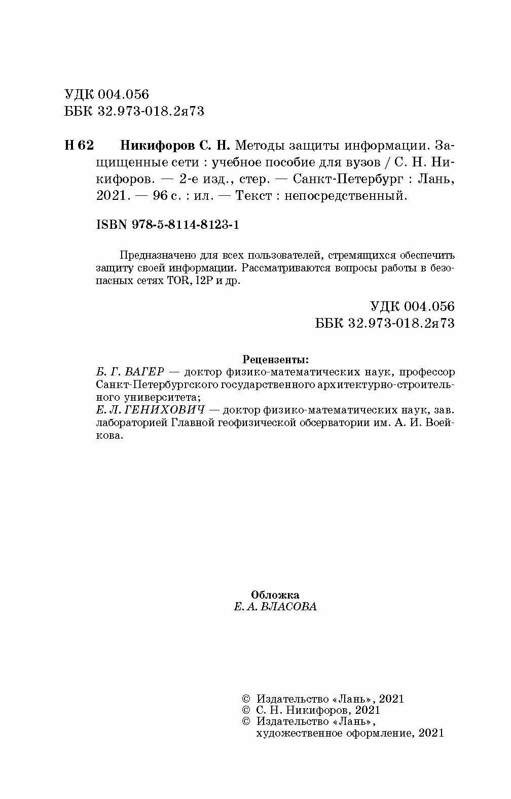 Методы защиты информации. Защищенные сети (С. Н. Никифоров); Издательство ЛАНЬ, 2021