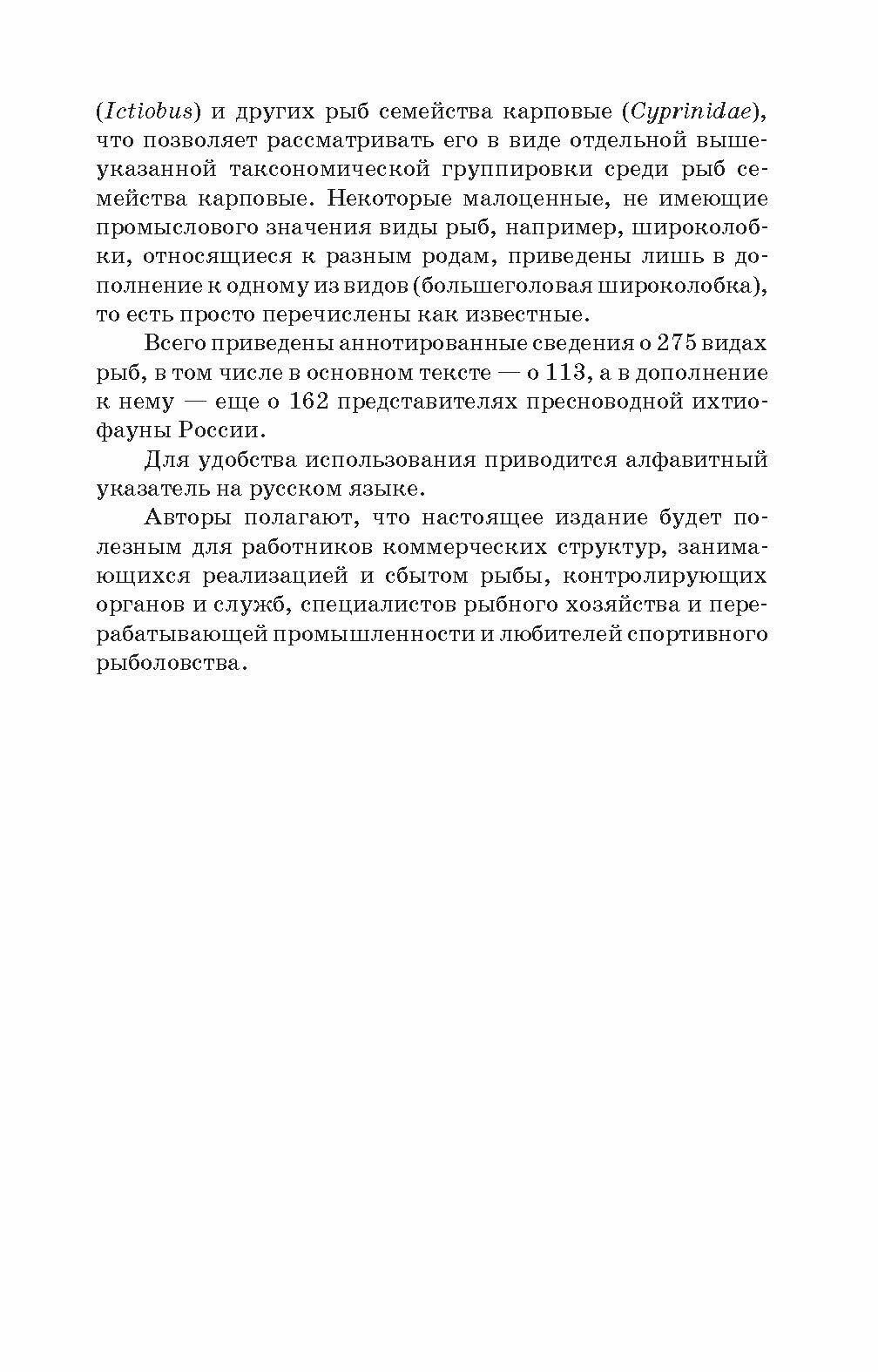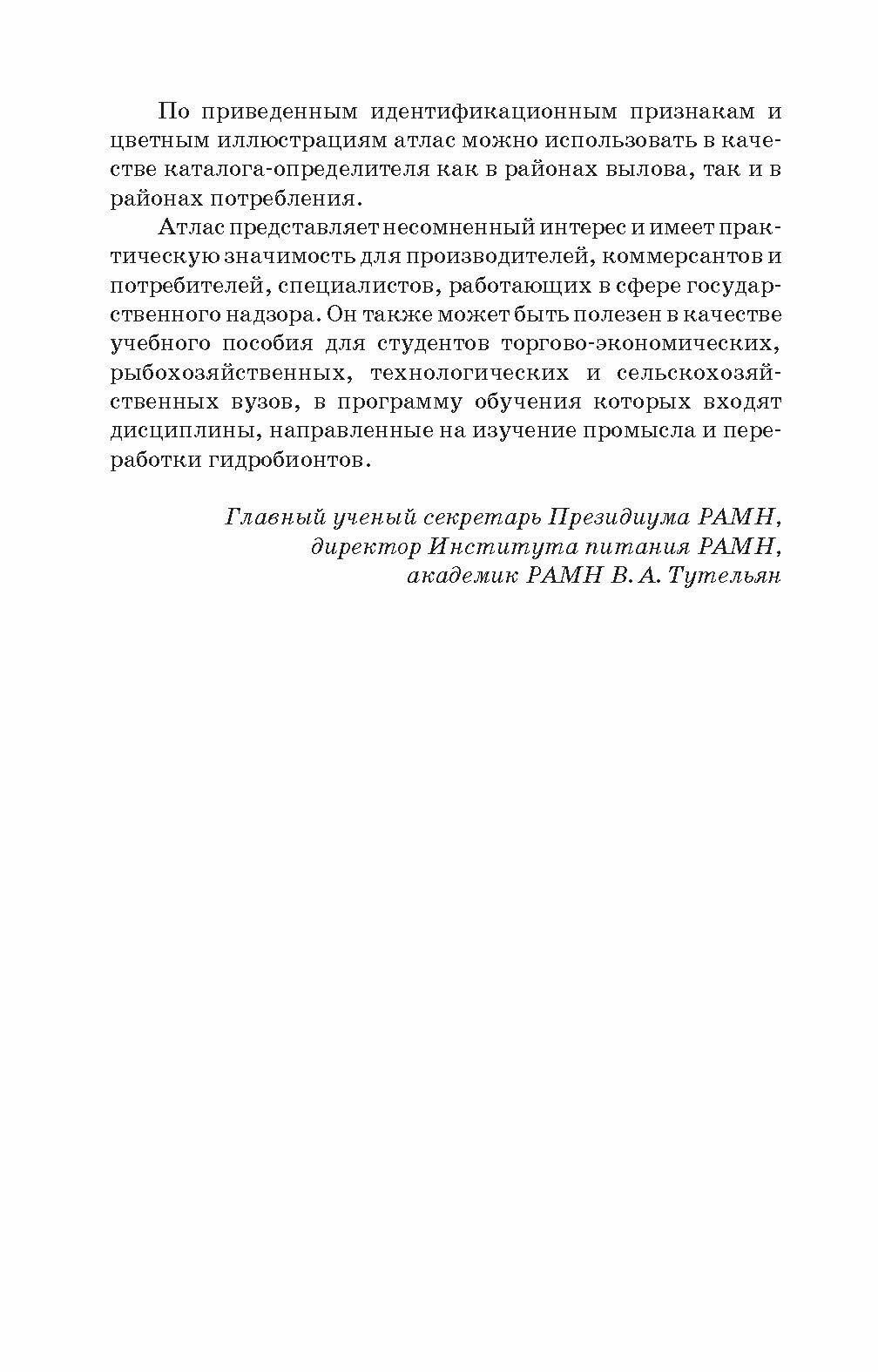 Атлас «Рыбы пресноводные и полупроходные» содержит сведения, которые не вошли в книгу «Экспертиза водных биоресурсов и продуктов их переработки. Качество и безопасность» (2016). В нем приведены русские и латинские названия рыб различных семейств и их важнейших представителей, имеющих наибольшее промысловое значение, идентификационные признаки каждого вида, а также возможные направления их использования. Атлас предназначен для широкого круга специалистов пищевой и рыбной промышленности, занимающихся промыслом, переработкой и реализацией рыбы и нерыбных продуктов, а также для работников рыбоохранных организаций, торговли и общественого питания. Она будет полезна для студентов высших учебных заведений и аспирантов, обучающихся по специальности «Товароведение и экспертиза товаров», «Технология продуктов из животного сырья» и другим технологическим специальностям пищевого профиля.