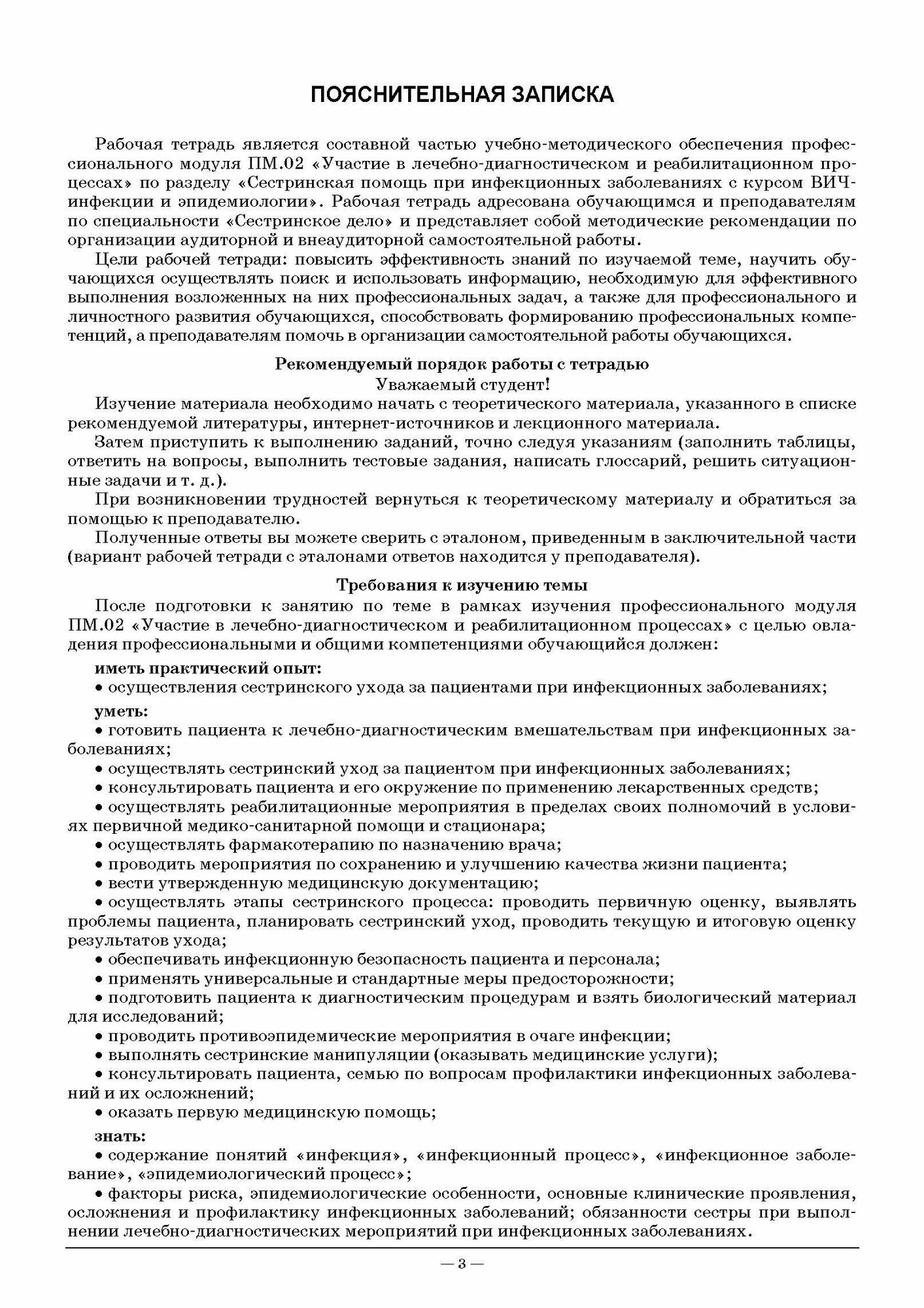 Пособие содержит эталоны ответов для рабочей тетради по разделу "Сестринская помощь при инфекционных заболеваниях с курсом ВИЧ-инфекции и эпидемиологии", являющегося составной частью учебно-методического комплекса профессионального модуля ПМ.02 "Участие в лечебно-диагностическом и реабилитационном процессах".