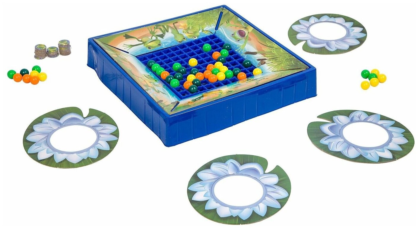 Занимательная развивающая игра. Лягушки встретились, чтобы принять участие в соревновании по прыжкам. Кто рискнёт прыгнуть в пруд? Обратите внимание: три шарика должны стоять в ряд. Поэтому девиз игры: Бросай-попадай - фишку забирай (выигрывай)! Игрок с наибольшим количеством фишек объявляется победителем.