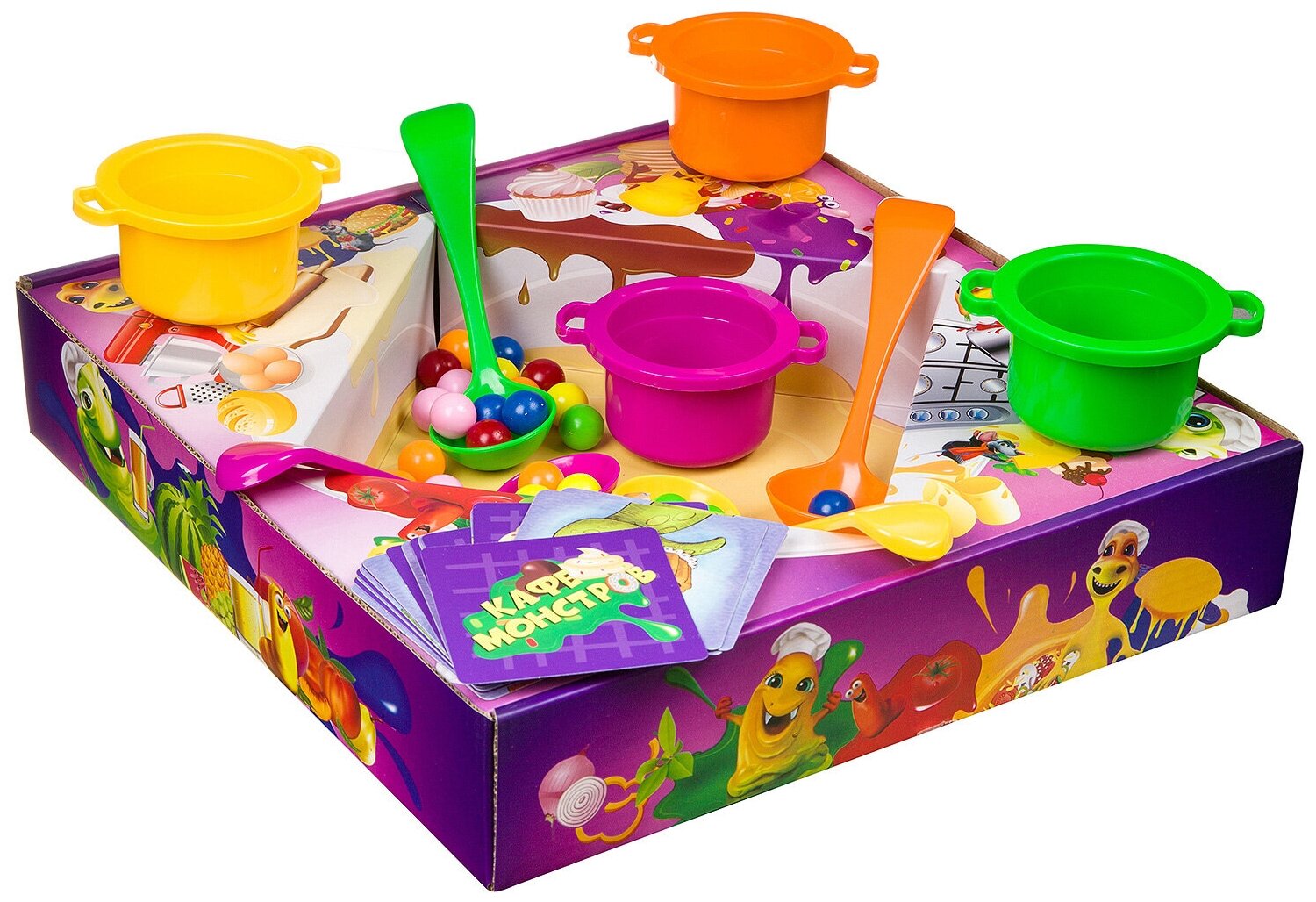 Помоги монстрикам украсить тортики. Игра на скорость и ловкость. Карточки с тортиками показывают, как надо украсить торт разноцветными сладкими шариками. Игроки пытаются как можно скорее вытащить нужный шарик с помощью кулинарной ложки из миски. Самый ловкий игрок получает в награду карточку с тортом.