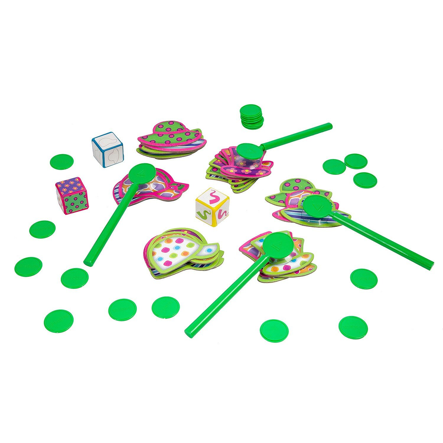Комплектация: 36 карточек со шляпами разных форм и цветов, 4 пластиковые палки с присосками, 3 кубика, примерно 20 жетонов, инструкция.