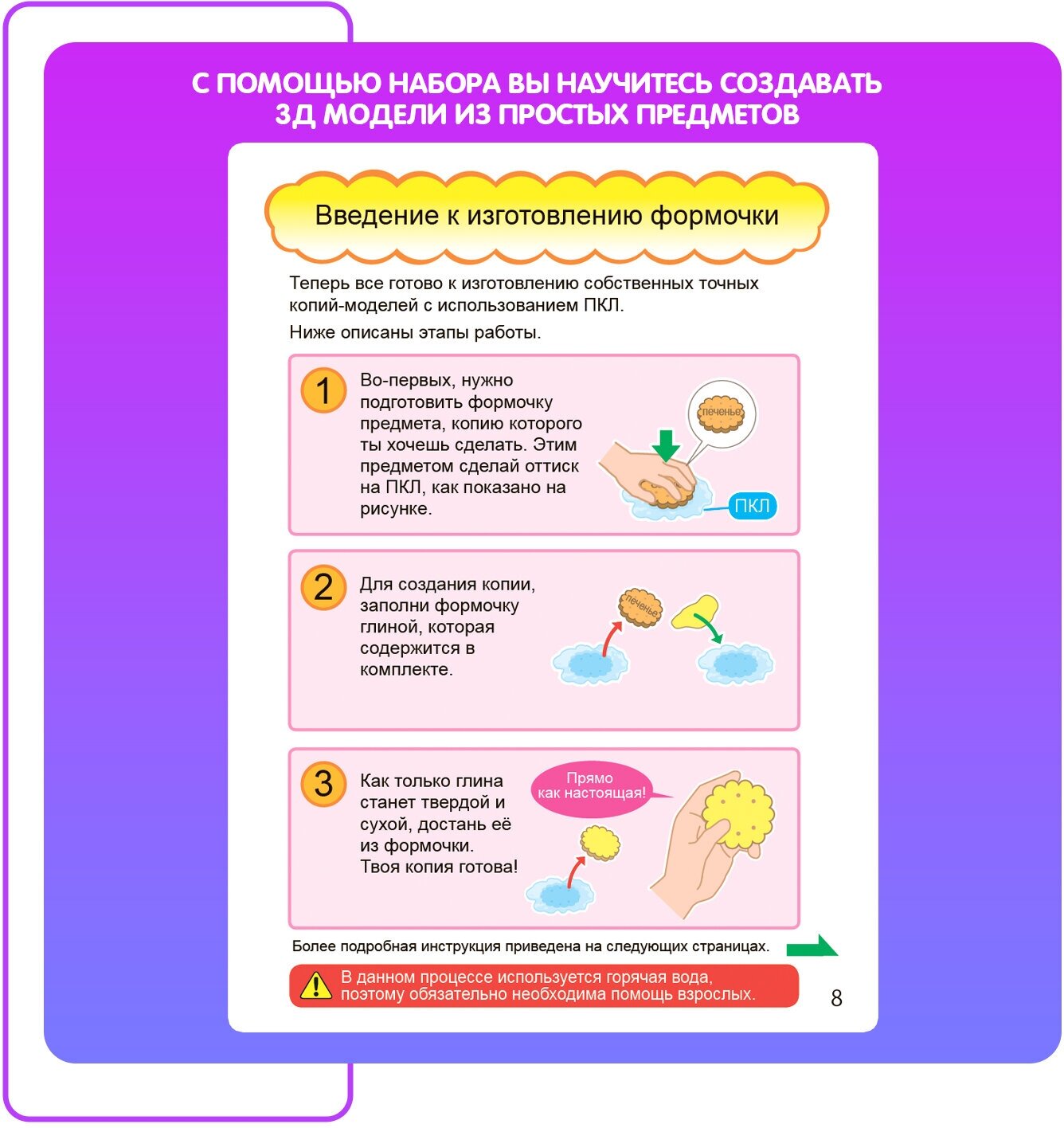 Забавный набор для создания точных трёхмерных копий разных мелких предметов. Узнай, как размягчить пластмассу и придать ей нужную форму, а также сделай копии своих любимых вещиц.