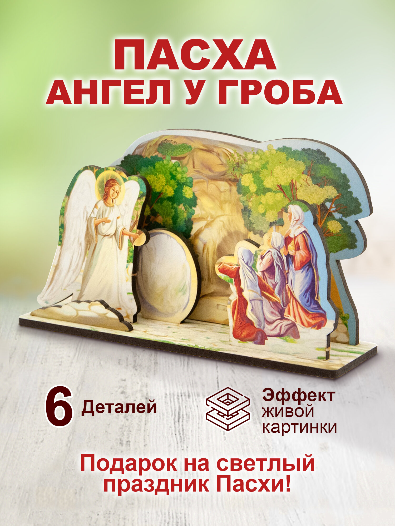 Пасхальный сувенир " Ангел у гроба" из мдф. Сборная модель состоит из 6 деталей. Элементы устанавливаются на общую подставку, создавая эффект живой объёмной картинки. Интерьерное украшение послужит достойным подарком на светлый праздик Пасхи!
