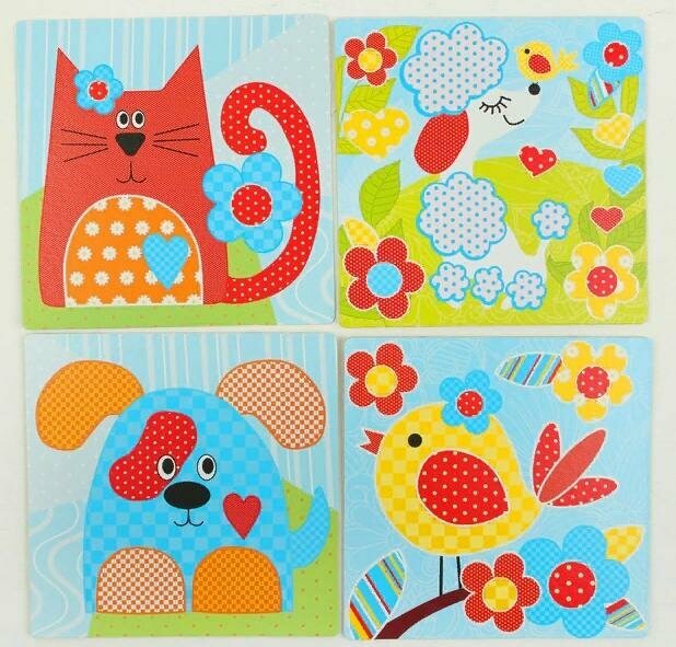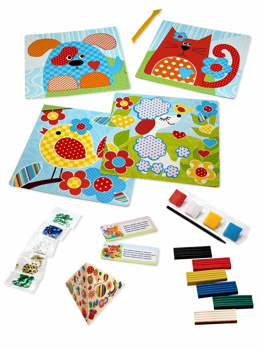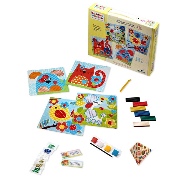 В наборе: 4 картинки 20х20 см, пластилин 6 цветов, пайетки 5 цветов, набор бумажек, стека, стилус.