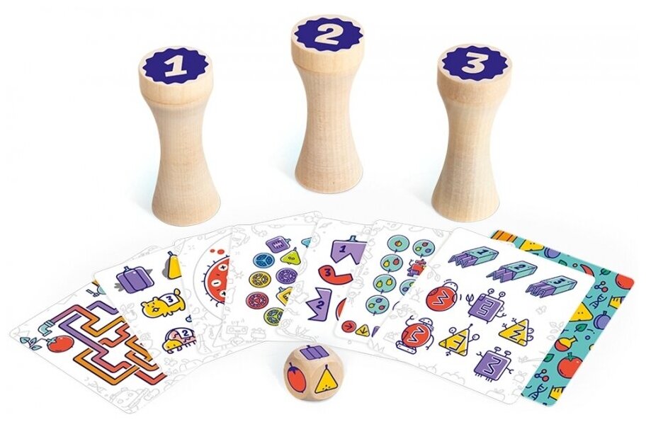 В наборе: 35 карт с заданиями, 3 деревянных тотема, деревянный кубик, иллюстрированные правила.