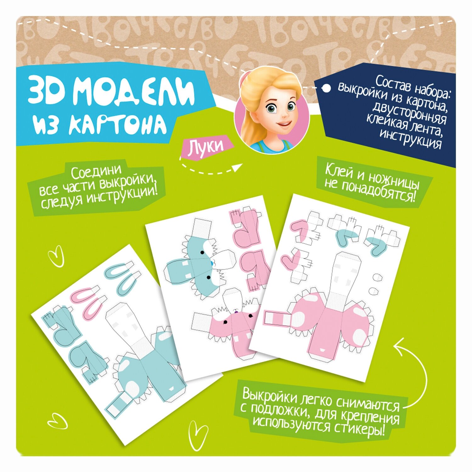 Состав набора: выкройки из картона, двусторонняя клейкая лента.