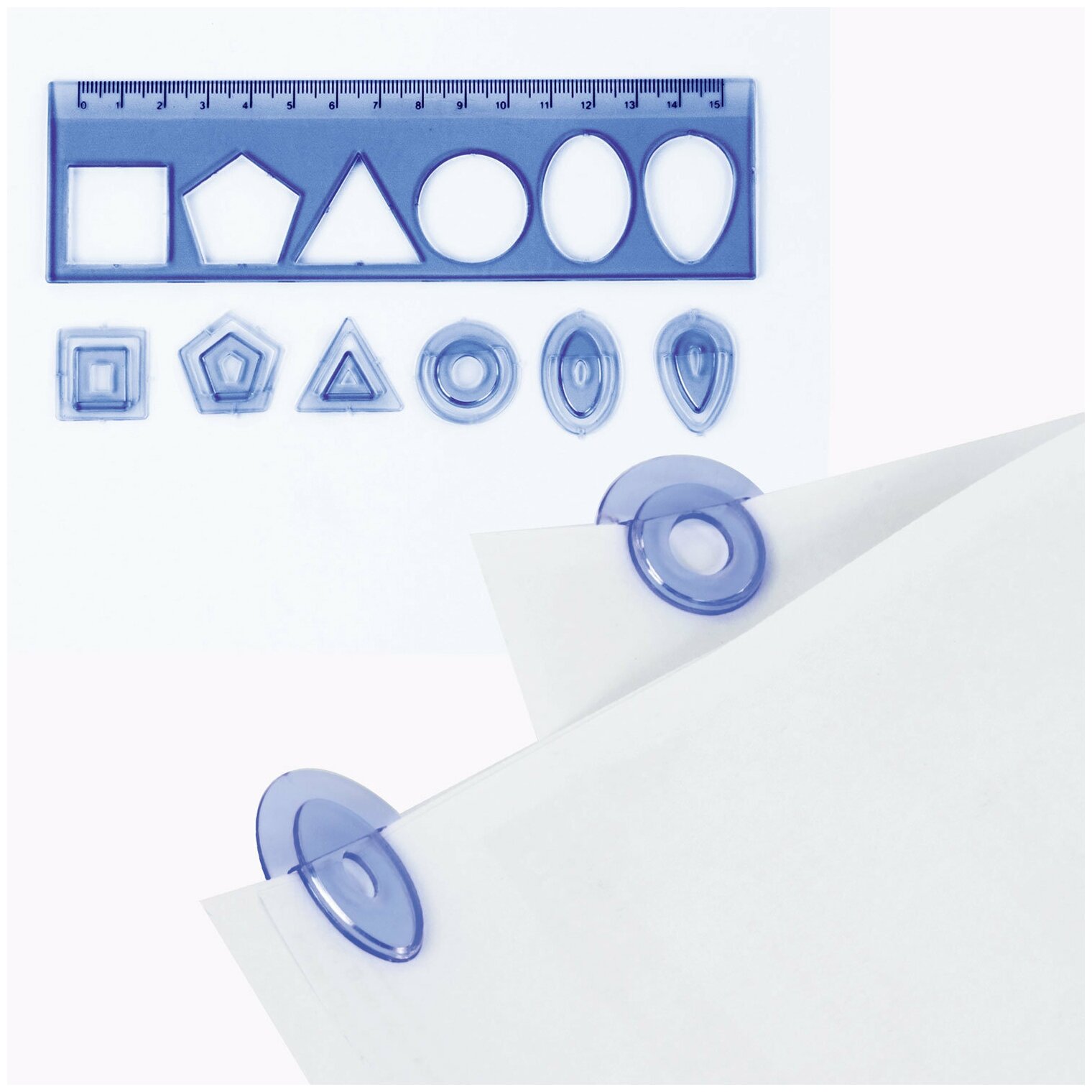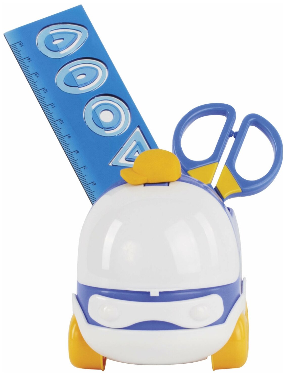 В наборе: линейка три в одном (линейка + закладка + лекала), резинки стирательные, безопасные ножницы, подставка.