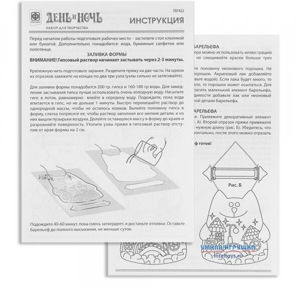 В набор входит: гипс, форма для заливки, пластиковый стек, кисточка, краски, акриловый лак, фотолюминофор, нить мулине, пластиковый контейнер, инструкция.