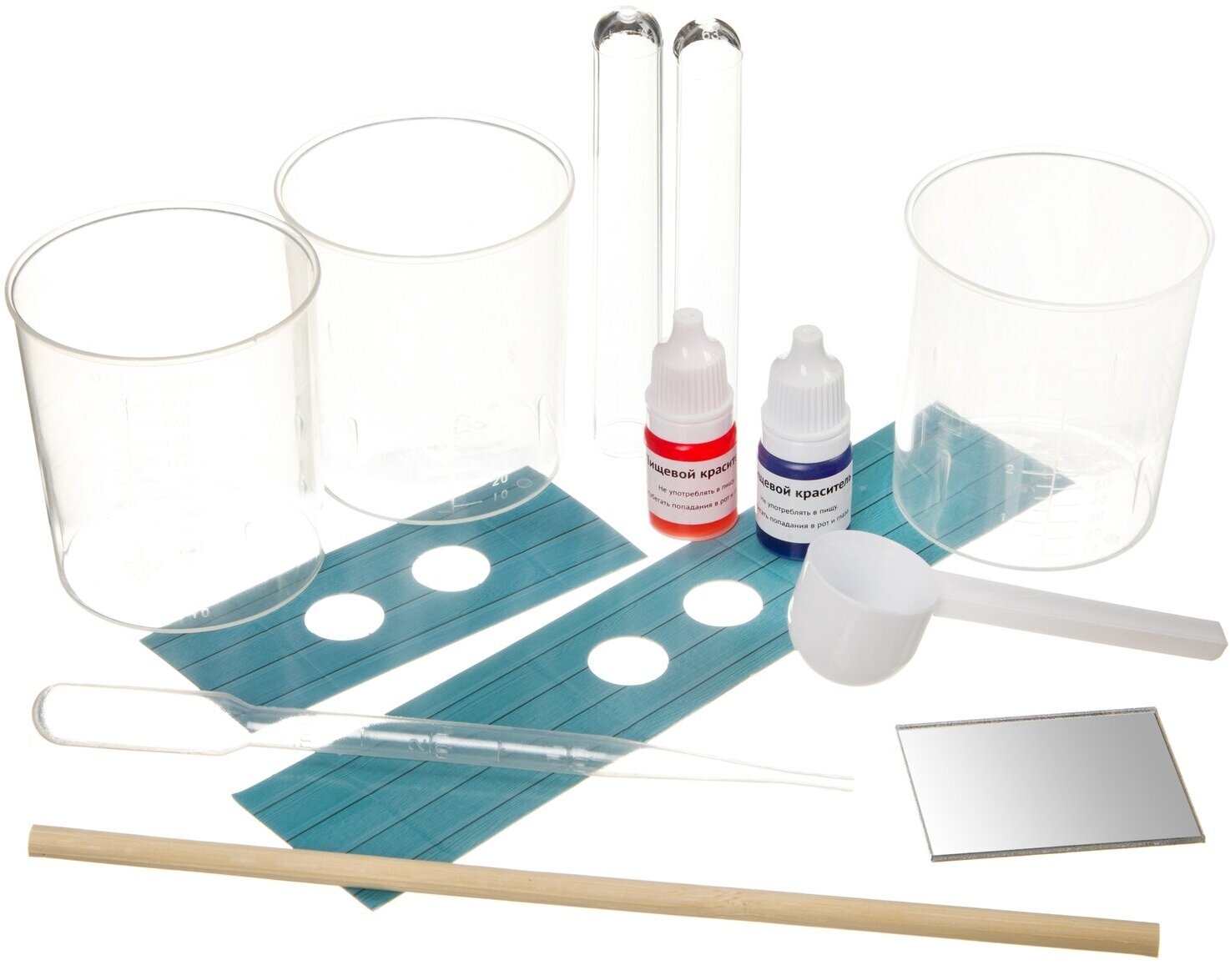 Состав набора: ложка, пипетка, 3 мерных стакана, 2 пробирки, краситель 3 шт., палочка для размешивания, подставка для пробирок, пластиковое зеркало, инструкция.