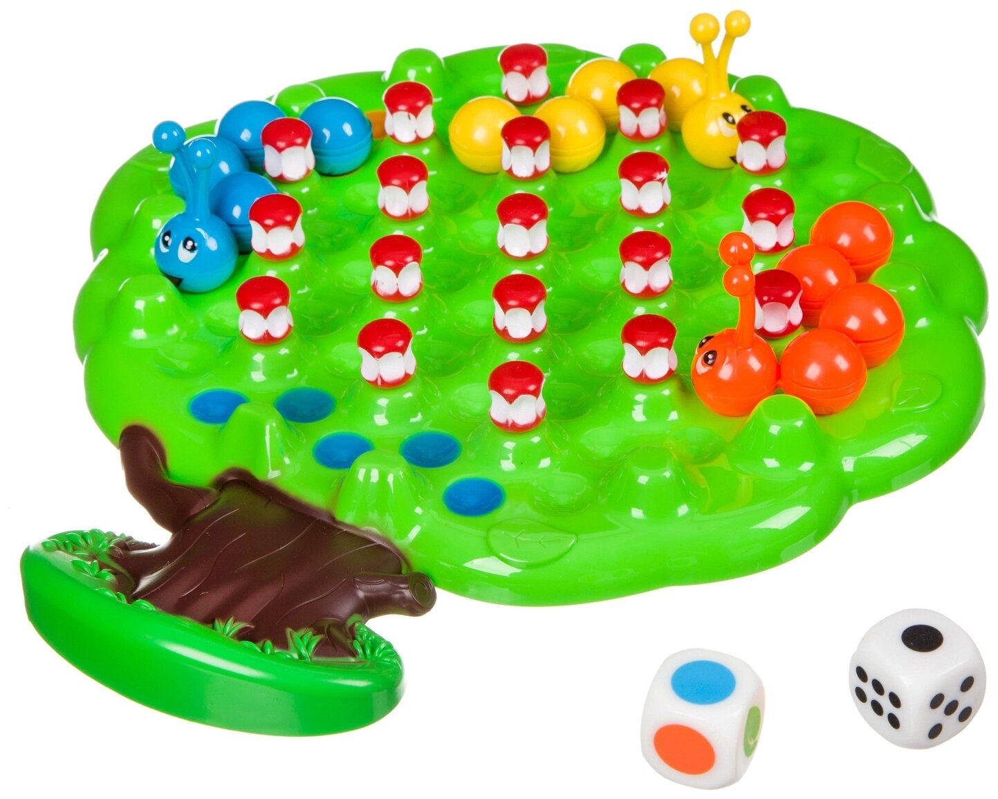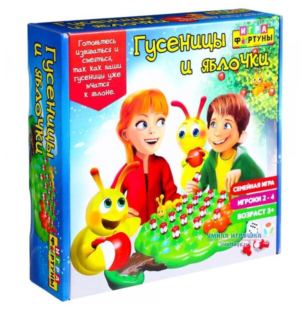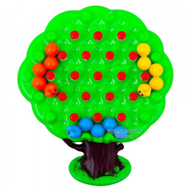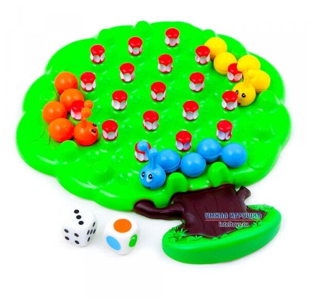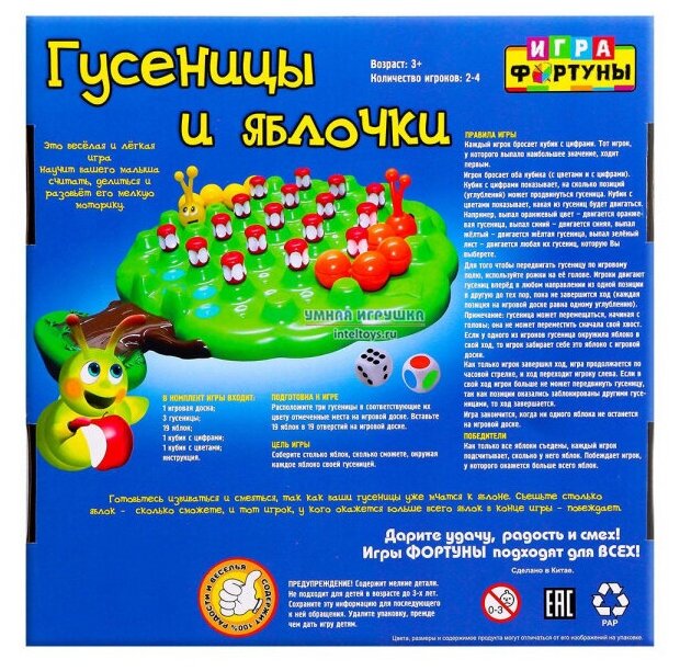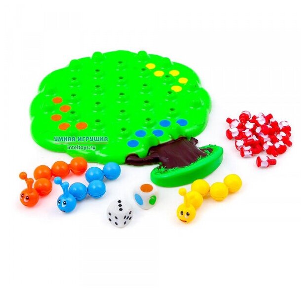| Комплектация | игровая доска,3 гусеницы,19 яблок,кубик с цифрами,кубик с цветами,инструкция |