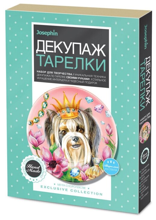 В наборе: стеклянная тарелка, краски, лак, клей, кисти, декупажная карта, инструкция.