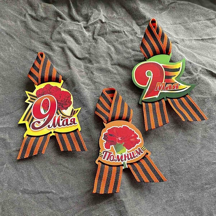 Памятные значки ко Дню Победы на георгиевской ленте - патриотические значки для вручения ветеранам и для проведения праздничных демонстраций.