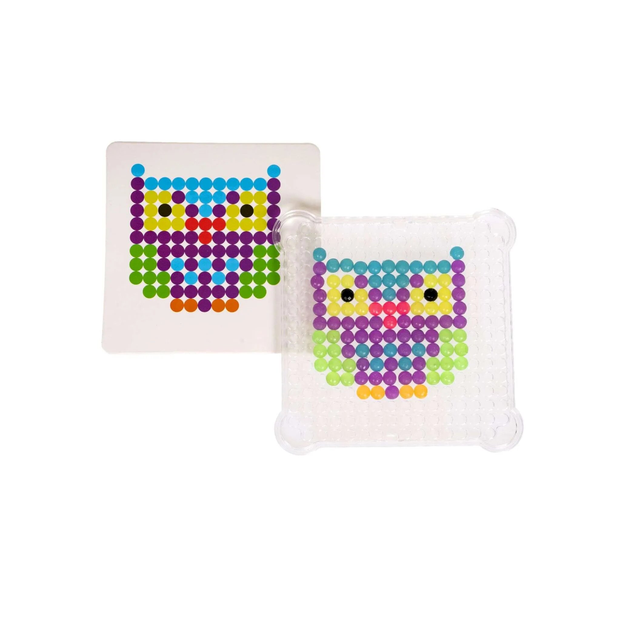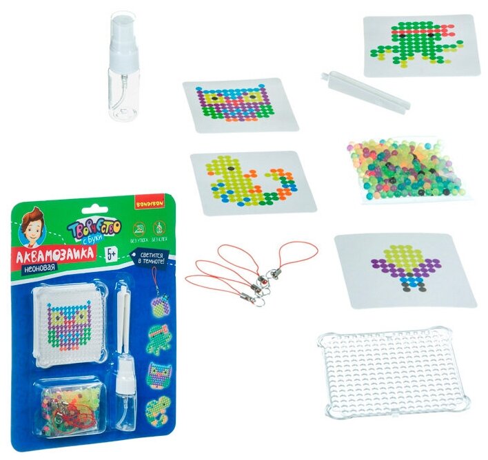 Состав набора: аквамозаика, пластиковый трафарет, 4 цветные схемы сборки, подвески для создания брелоков, пинцет и бутылочка - распылитель для воды.