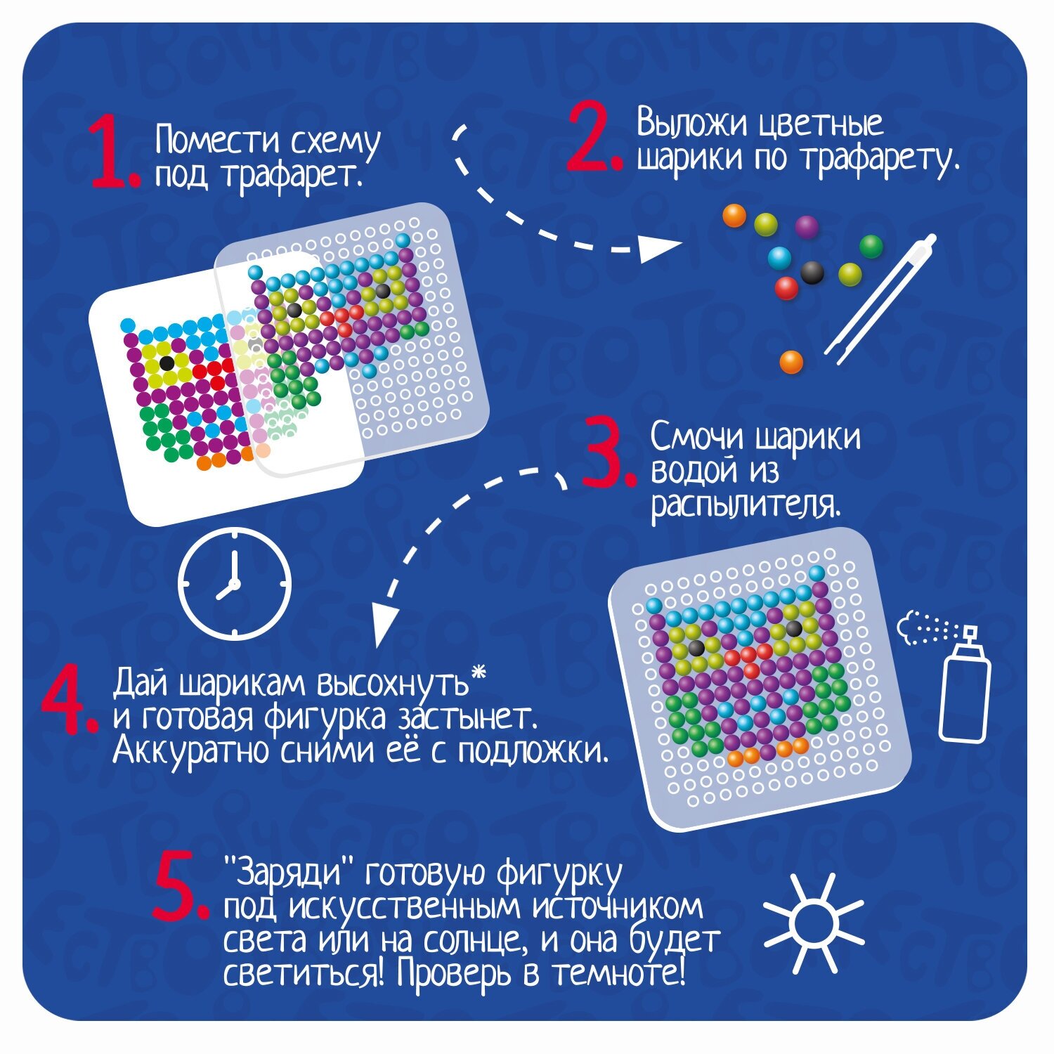 Разложите цветные шарики по трафарету, слегка смочите их водой, дайте им высохнуть и готовая фигурка из ярких бусин застынет. Зарядите готовую фигурку под искусственным источником света или на солнце в течение некоторого времени и она будет светиться! Проверьте в темноте!
