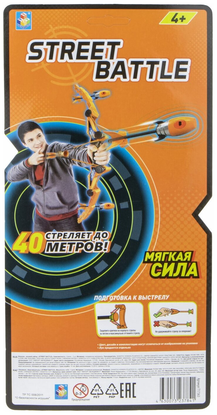 Игровой набор "Street Battle" включает в себя 3 стрелы: 2 из них с мягкими наконечниками, а 1 - с присоской. Стрелы издают свистящий звук в полете.