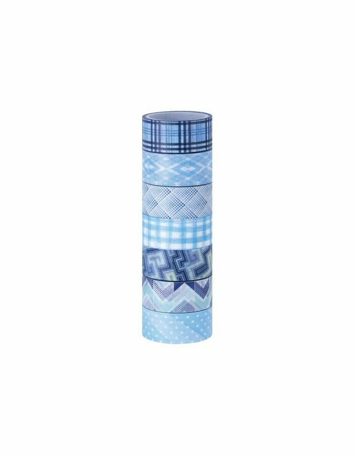 В наборе содержится 7 бумажных лент с различными дизайнами в синих оттенках на полупрозрачной клеевой основе, каждая из которых намотана на пластиковую втулку. Ширина ленты 15 мм позволяет наклеить её даже на небольшие поделки, а длина 3 м даёт большой простор для творчества.