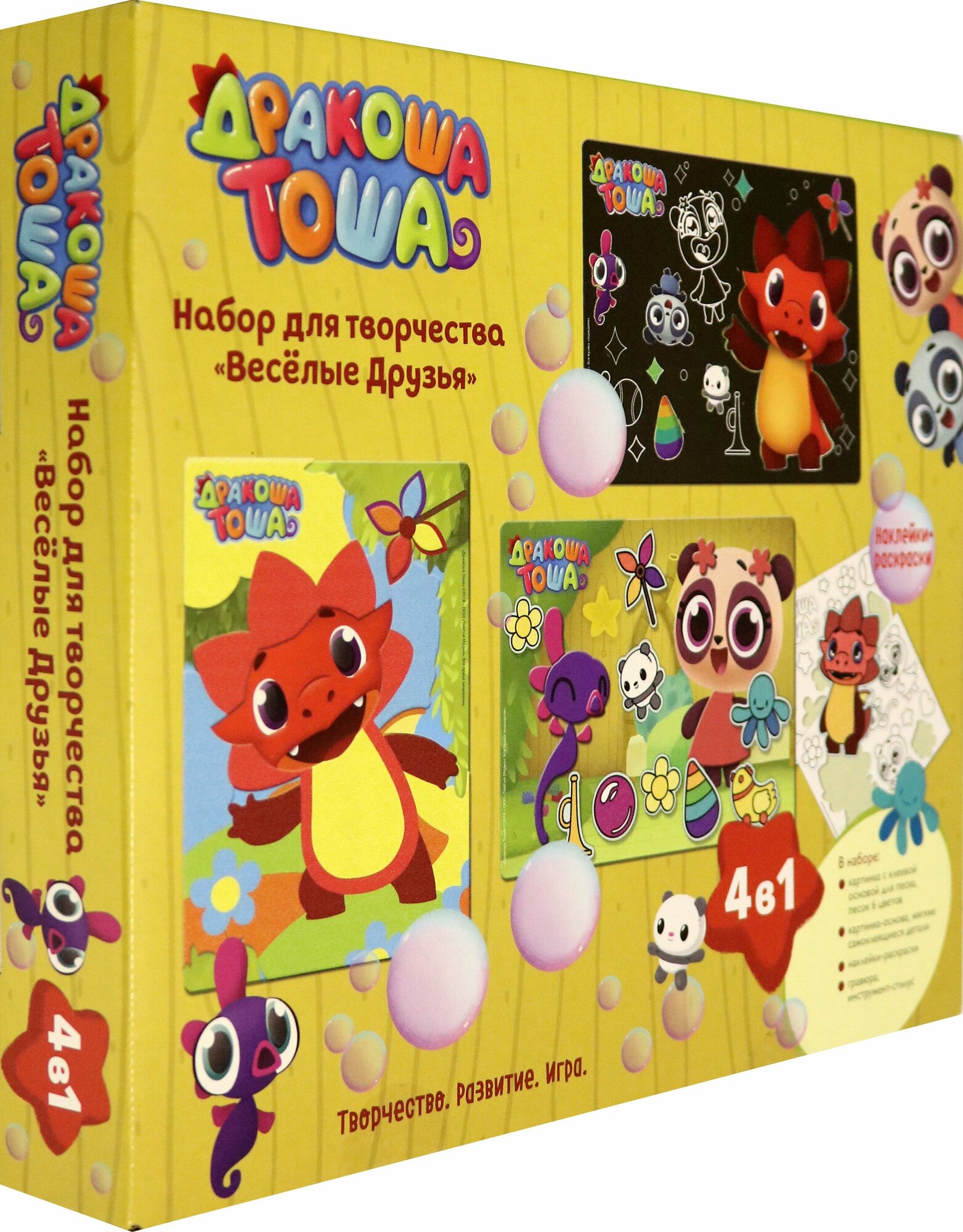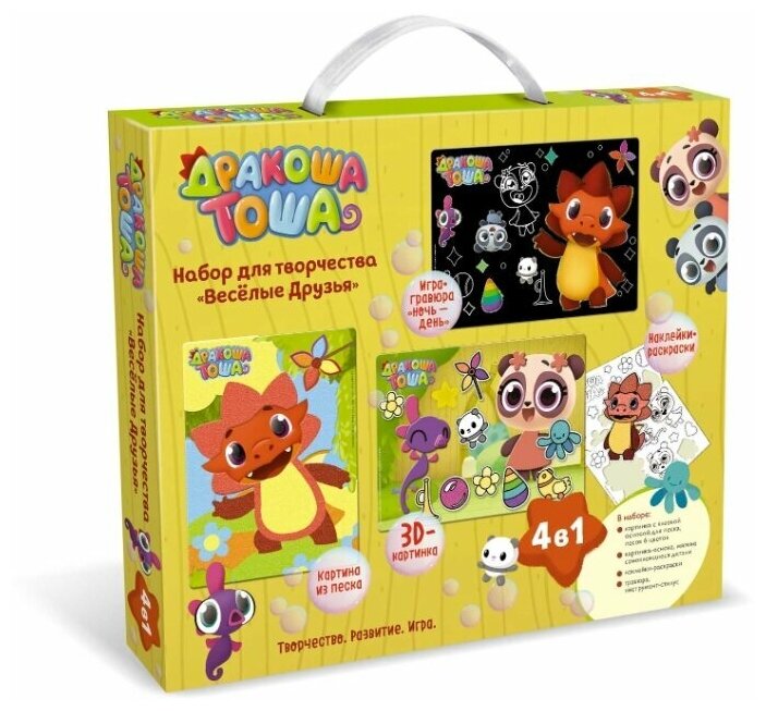 Набор для творчества Дракоша Тоша "Веселые Друзья" способствует развитию ребенка с помощью простого и очень увлекательного творчества. Ваш ребенок узнает, как можно сделать картину из песка без клея и ножниц. Игра – гравюра «ночь-день» развивает внимание и мелкую моторику. 3D-аппликация из мягкого материала ЭВА формирует пространственное и логическое мышление. А раскрашивать намного интереснее, если это - наклейки, которыми можно дополнить аппликацию, или просто приклеить туда, куда хочется.