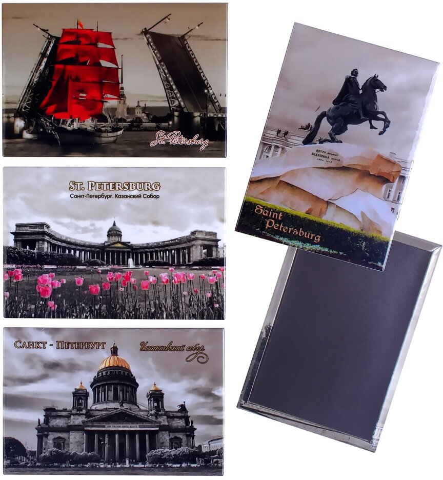 Комплект закатных магнитов на металлической основе с изображением видов самых известных достопримечательностей города Санкт-Петербург. Набор состоит из 5 магнитов размером 55х80х3 мм и упакован в паковочный пакетик. Это отличный подарок в качестве сувенира. Можно повесить на холодильник или другую металлическую поверхность.