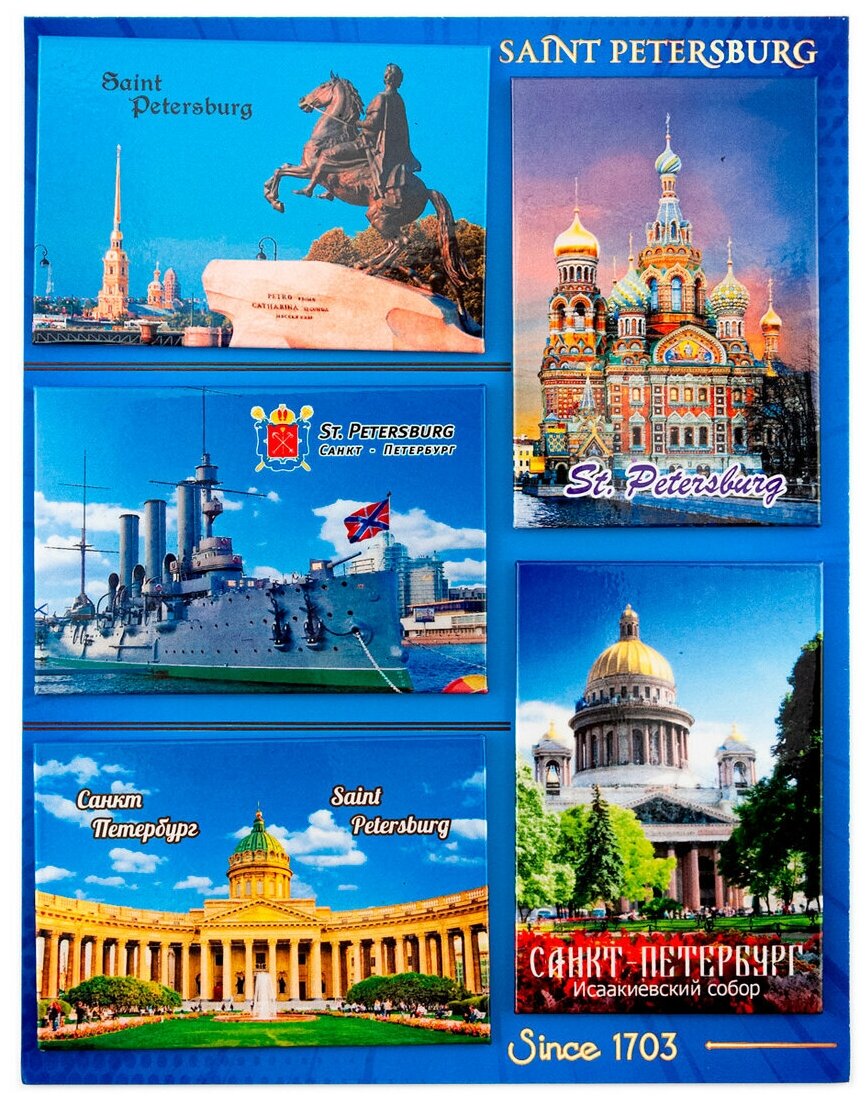 Комплект закатных магнитов на металлической основе с изображением видов самых известных достопримечательностей города Санкт-Петербург. Набор состоит из 5 магнитов размером 55х80х3 мм и упакован в паковочный пакетик. Это отличный подарок в качестве сувенира. Можно повесить на холодильник или другую металлическую поверхность.