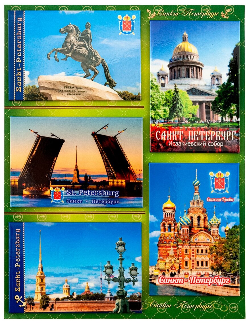 Комплект закатных магнитов на металлической основе с изображением видов самых известных достопримечательностей города Санкт-Петербург. Набор состоит из 5 магнитов размером 55х80х3 мм и упакован в паковочный пакетик. Это отличный подарок в качестве сувенира. Можно повесить на холодильник или другую металлическую поверхность.
