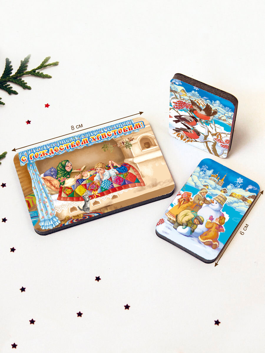 Красочный новогодний набор магнитов, выполнен чётко, не размытая картинка, вызвал детские ностальгические воспоминания о русской морозной зиме, игры в снежки, снеговиков и снежной крепости, магнит с печкой добавляет уюта и тепла, всю жизнь мечтала оказаться в деревенской доме и поспать на такой печке)) На холодильнике держится хорошо, оставила в рамочке для полной картины.
